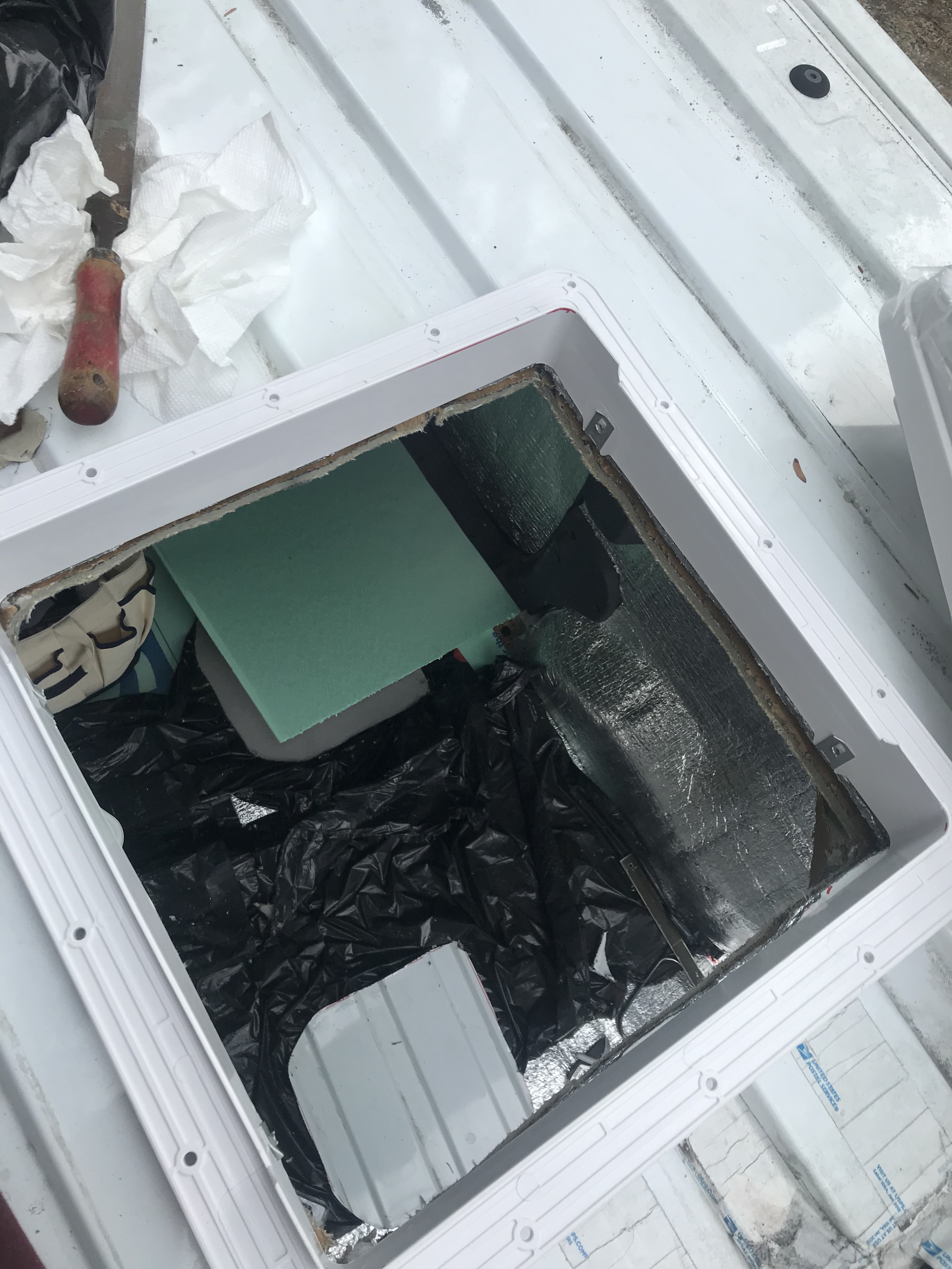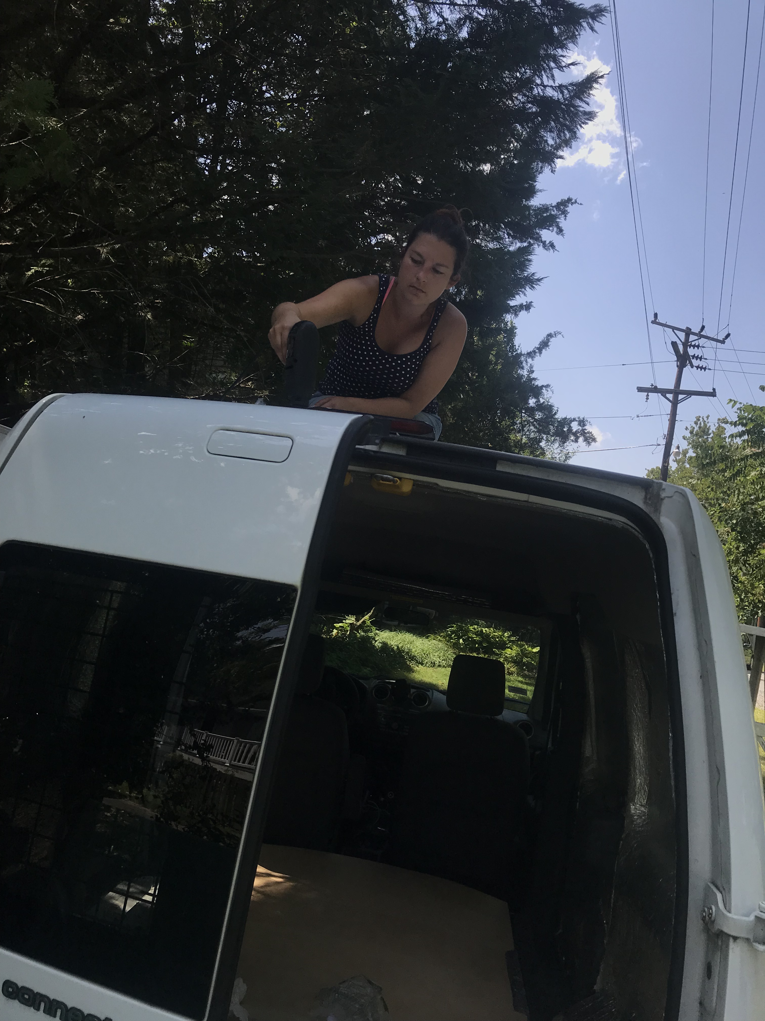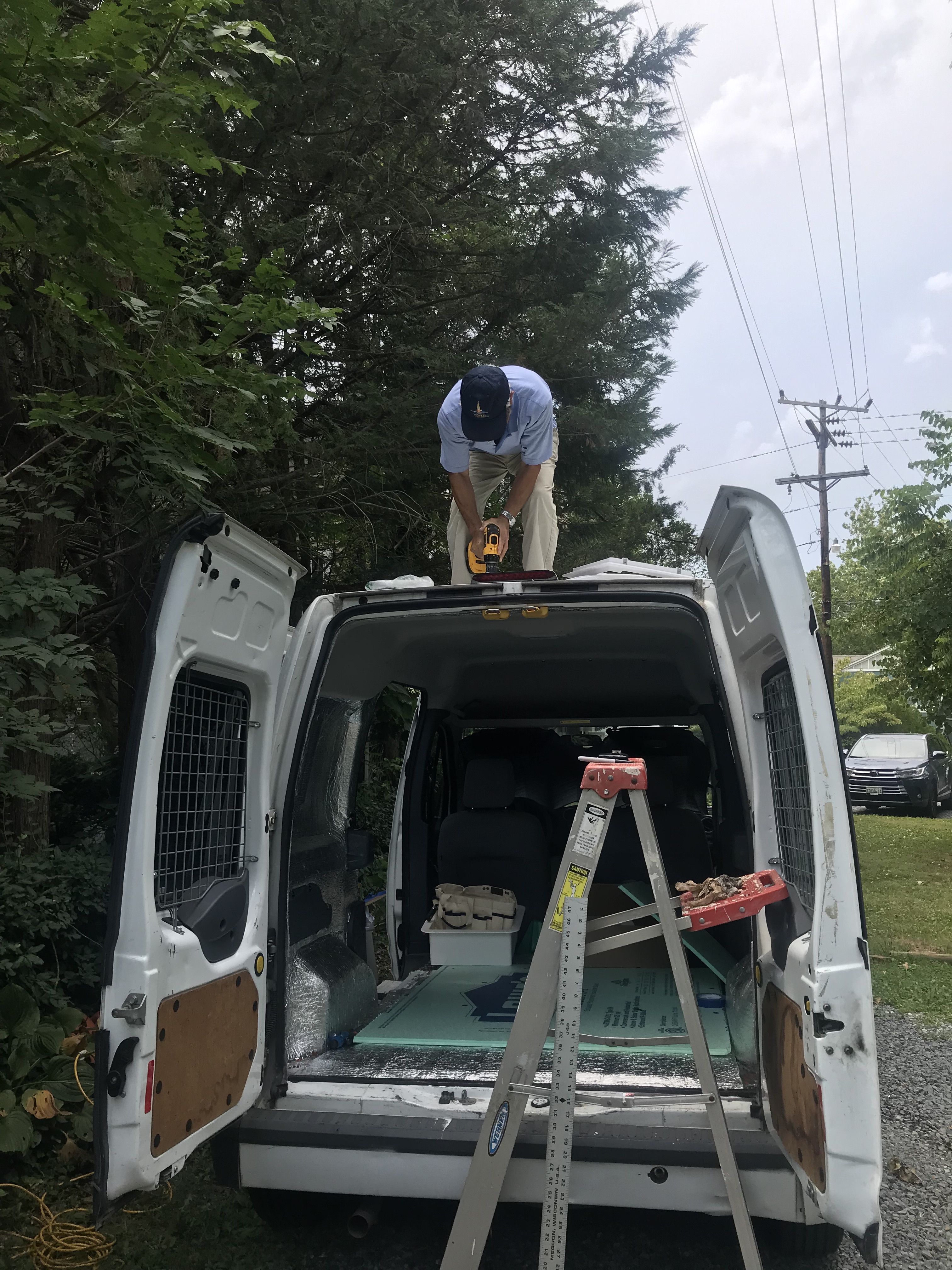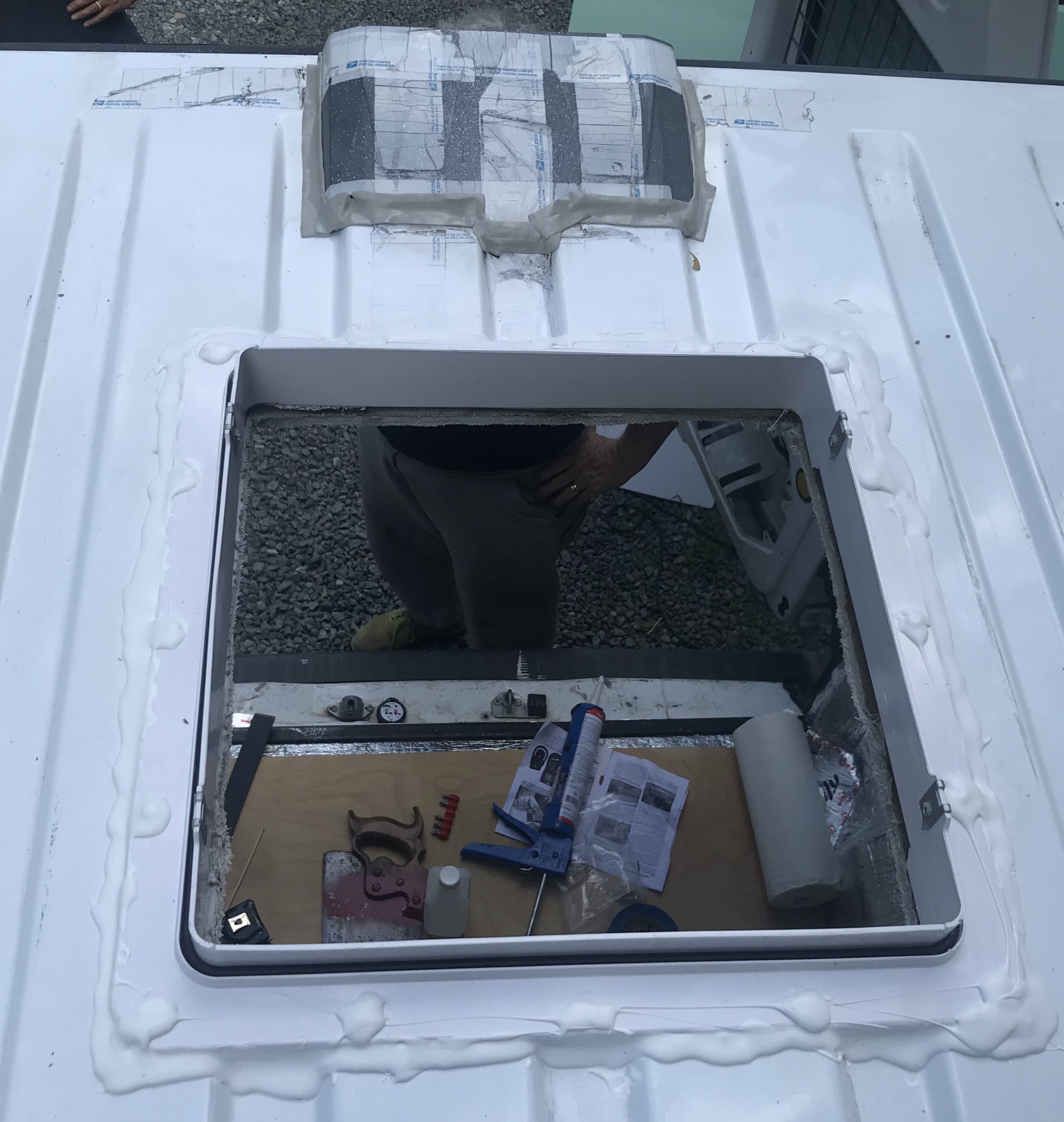 The first step to install the fan after ordering all the things needed is to take a giant plunge and chop a hole in the roof of the van. Yes, you read that right, cut a 14″ square in the roof of my future home. So there’s that. This requires a good saw that I don’t have but a few friends and connections do, so I was able to get a neighbor to help me out with this part.