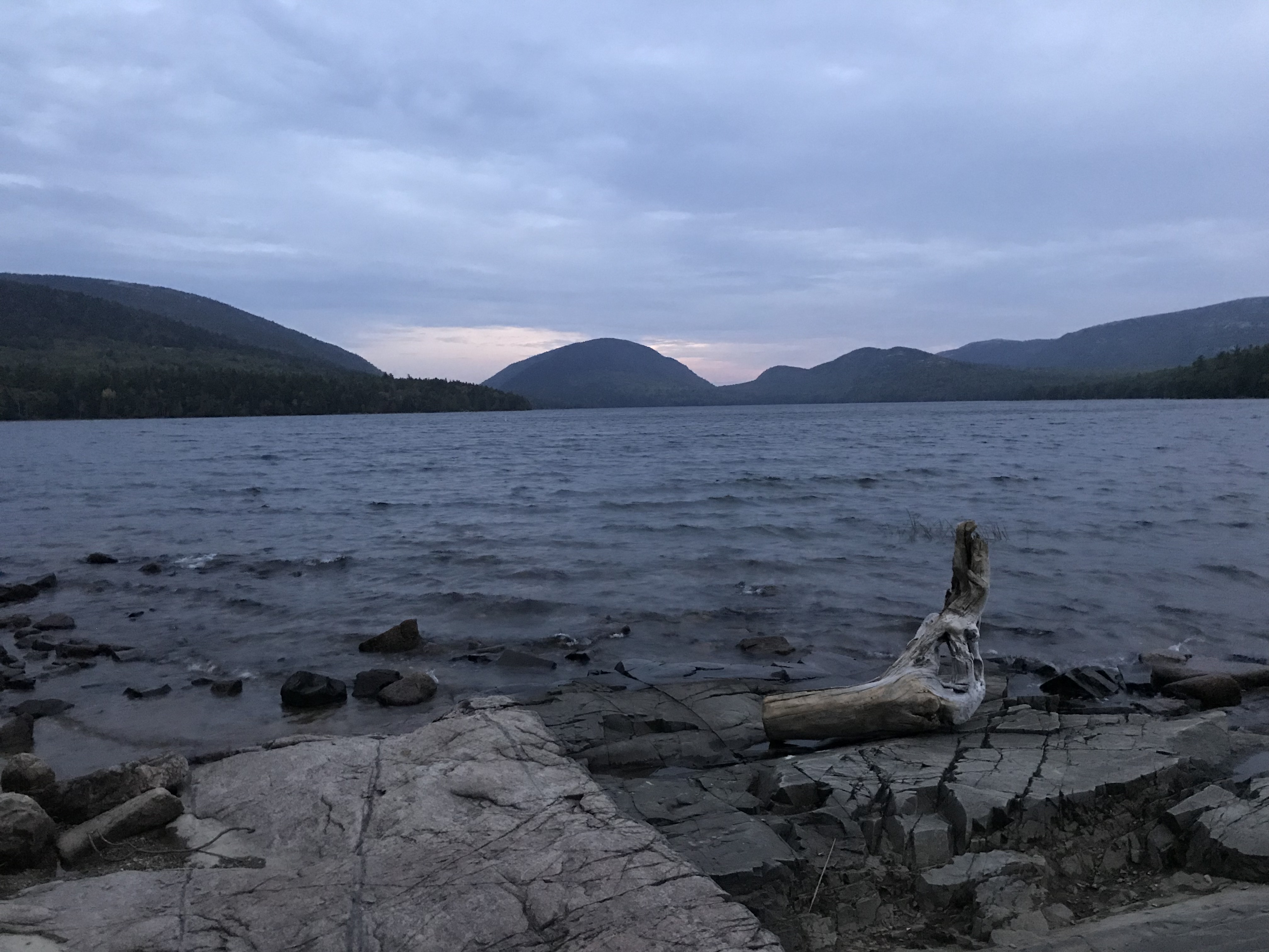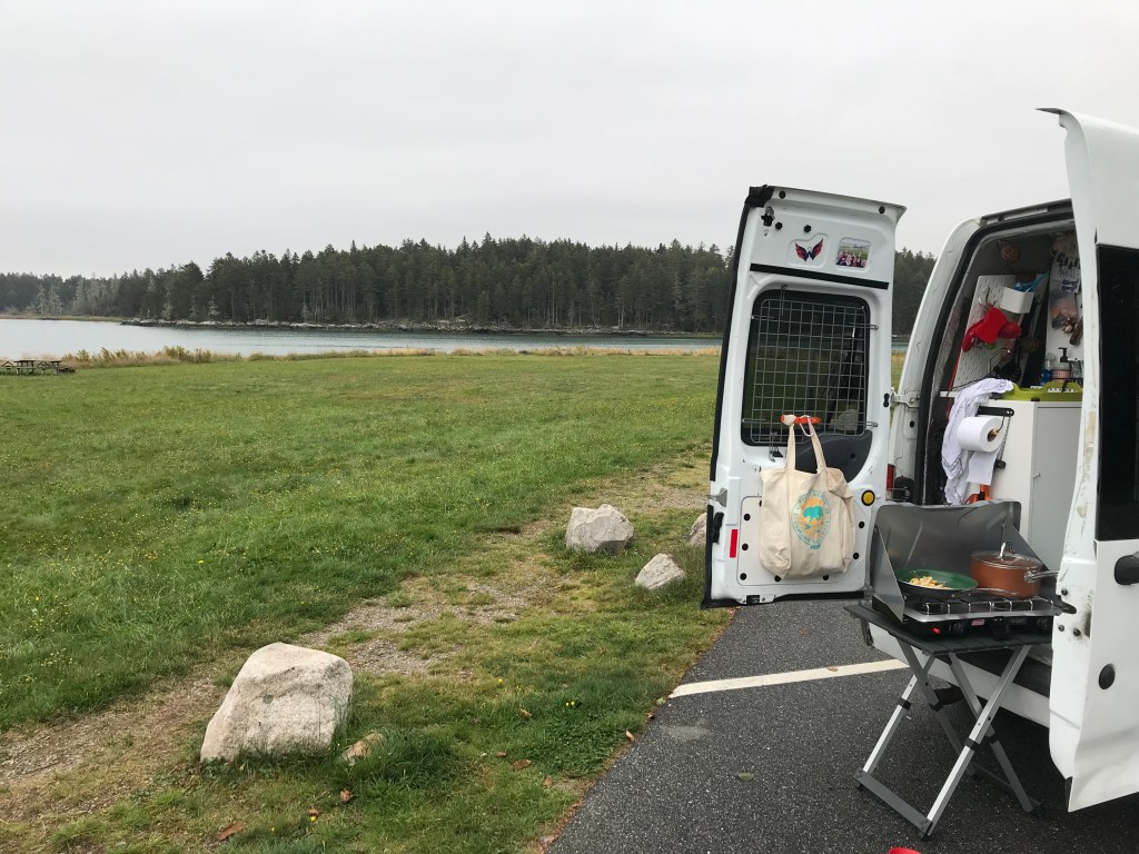 Did sunset at Eagle Lake and had the place to myself, and the next morning after one of 3 glam nights in the Walmart lot (hey, it’s free and I just dropped $ for my park pass) made some breakfast in a park just crossing onto Mt. Desert Island area from mainland. So. Many. Mosquitoes. I looked bruised from smacking a good number on my legs.