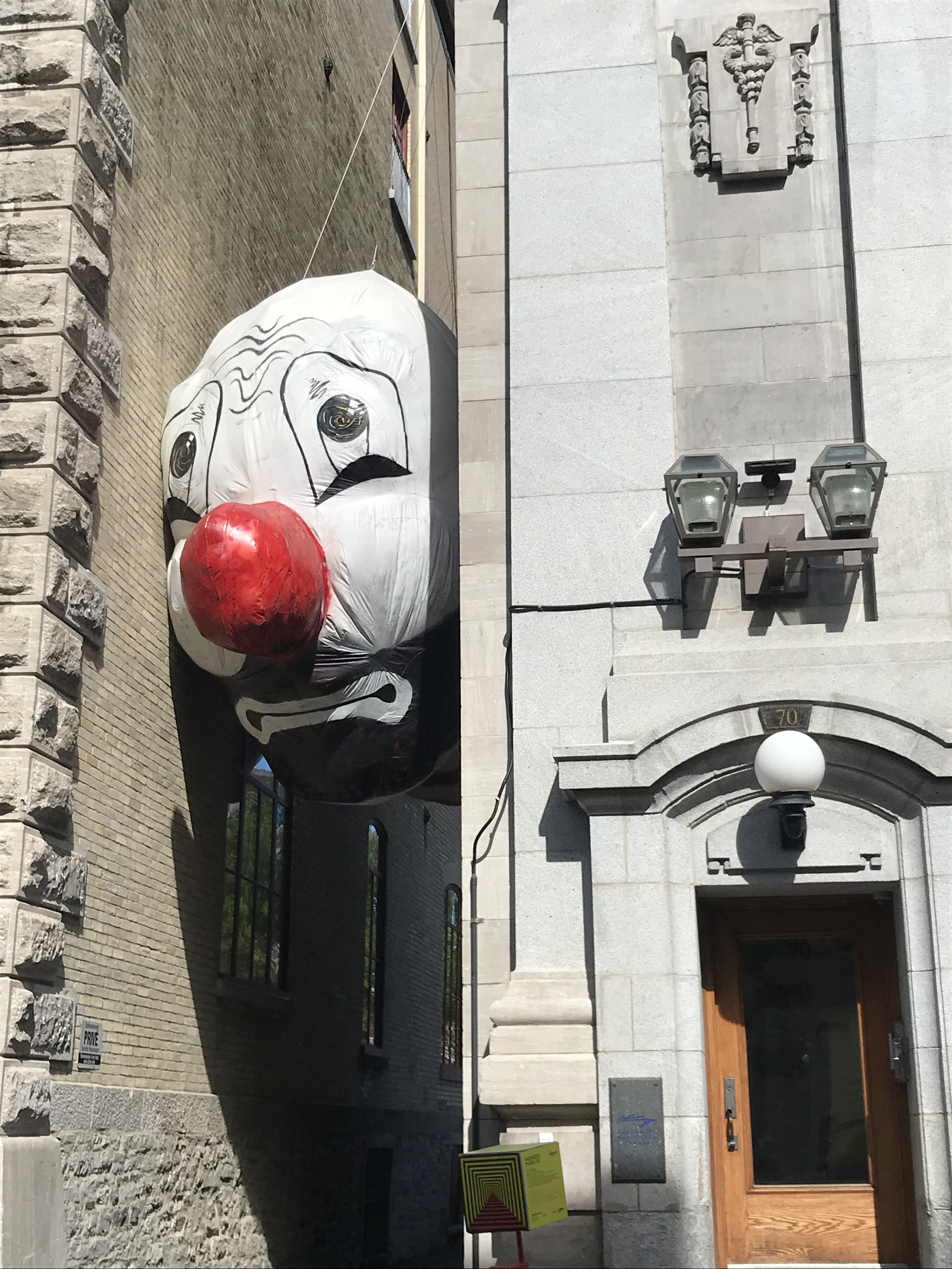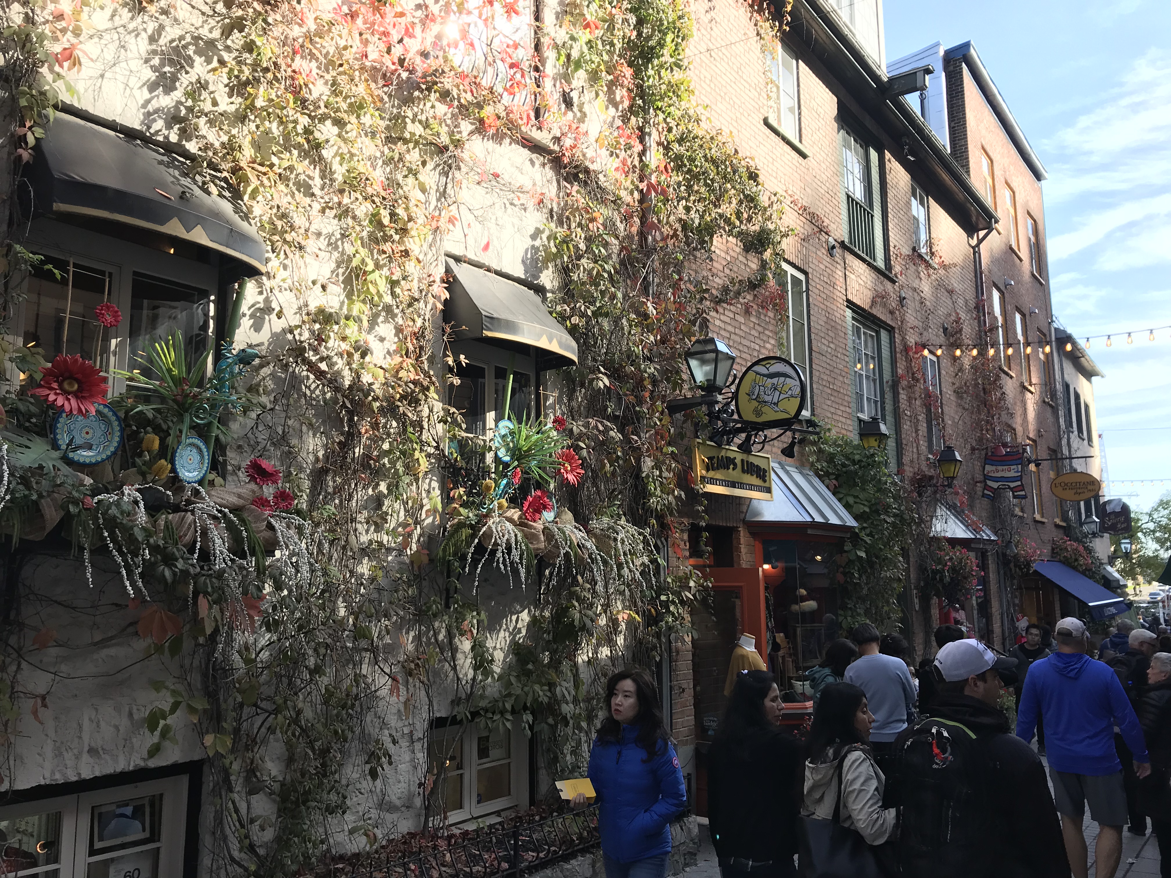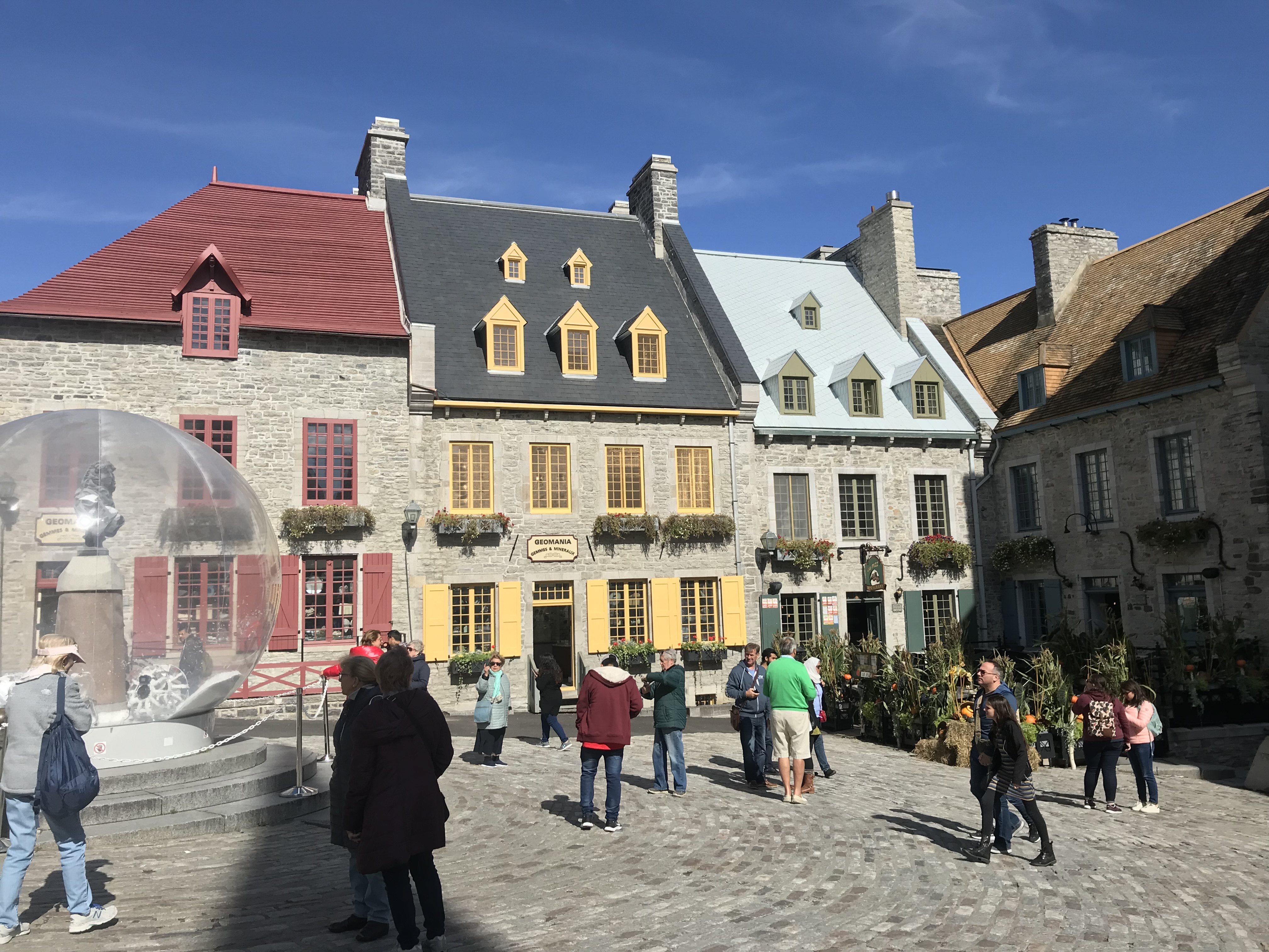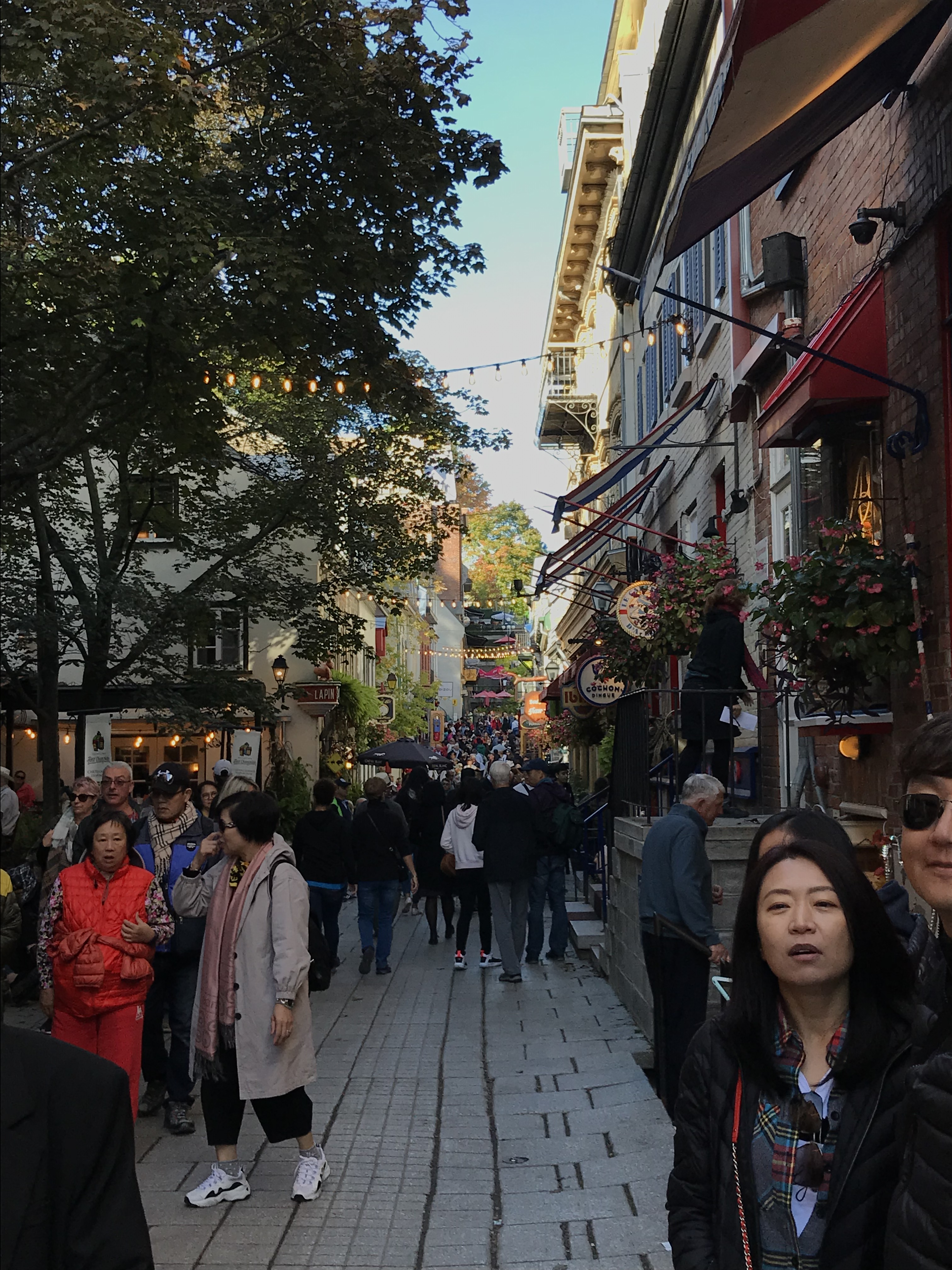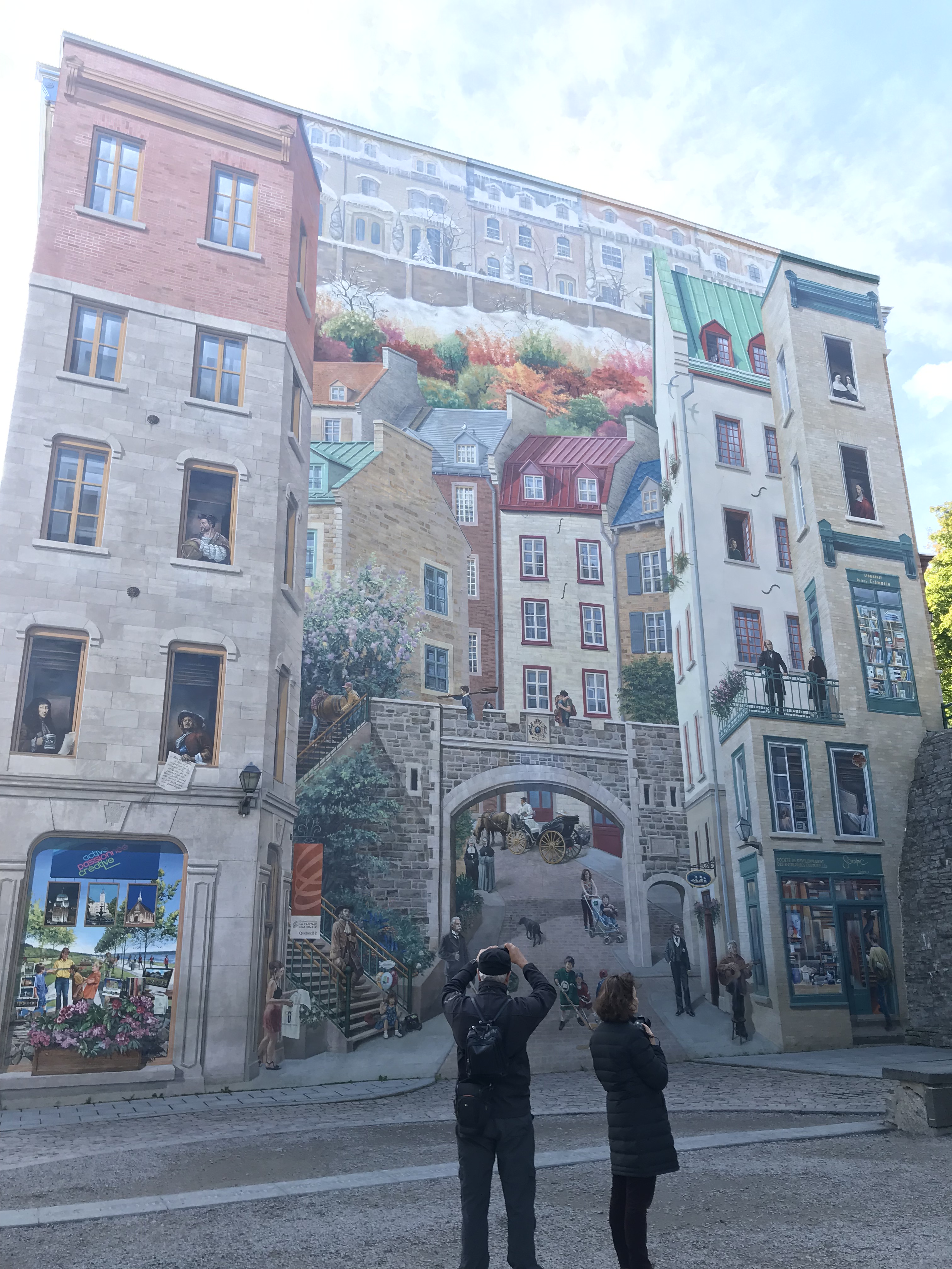 Old Quebec City is like Disney’s version of France in Epcot. Very clean, street artists, music ranging from the Cats soundtrack to classic accordion tunes coming from somewhere unidentifiable, even a giant snow globe! You know every adorable shop is a tourist trap waiting to lure you in to get overpriced snacks or a t-shirt that for no reason has a picture of the Millennium Falcon that says Quebec. But the bright colors, happy people looking astonished to encounter yet another enchanting shopping street at every turn, and interesting (and in one case creepy as hell- see below) street art are too fun not to get swept away along with everyone else.