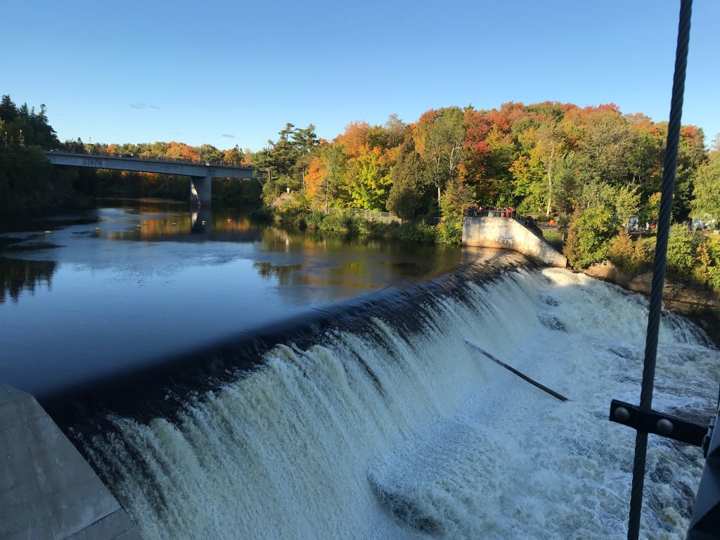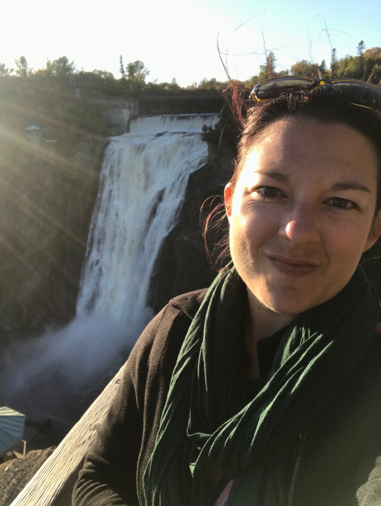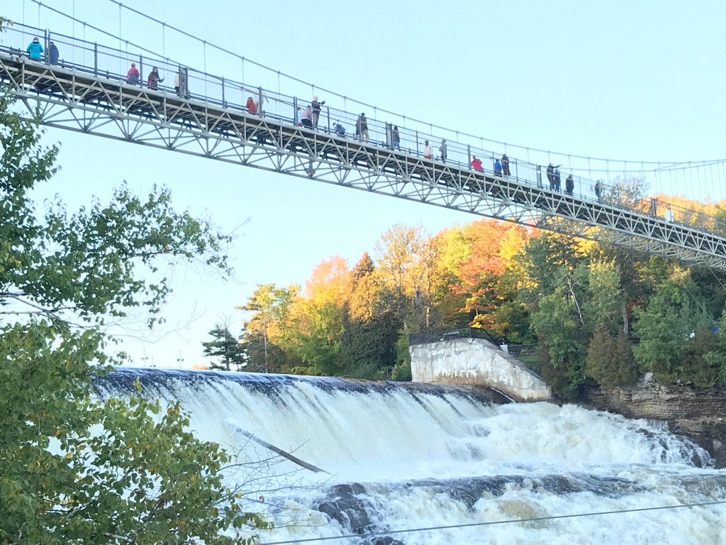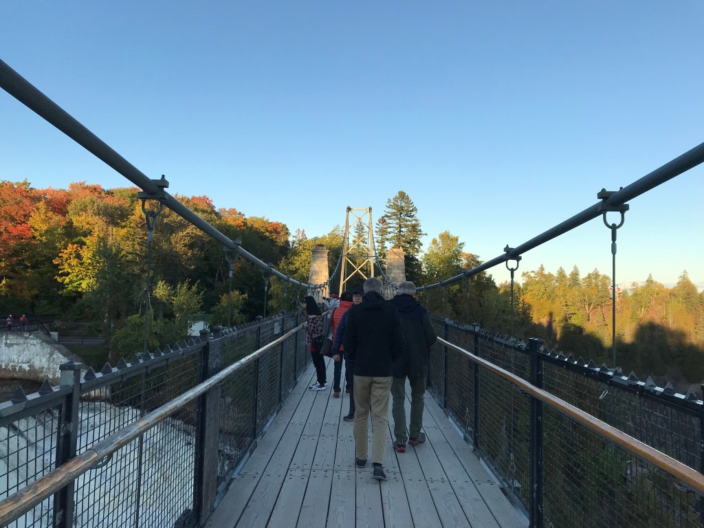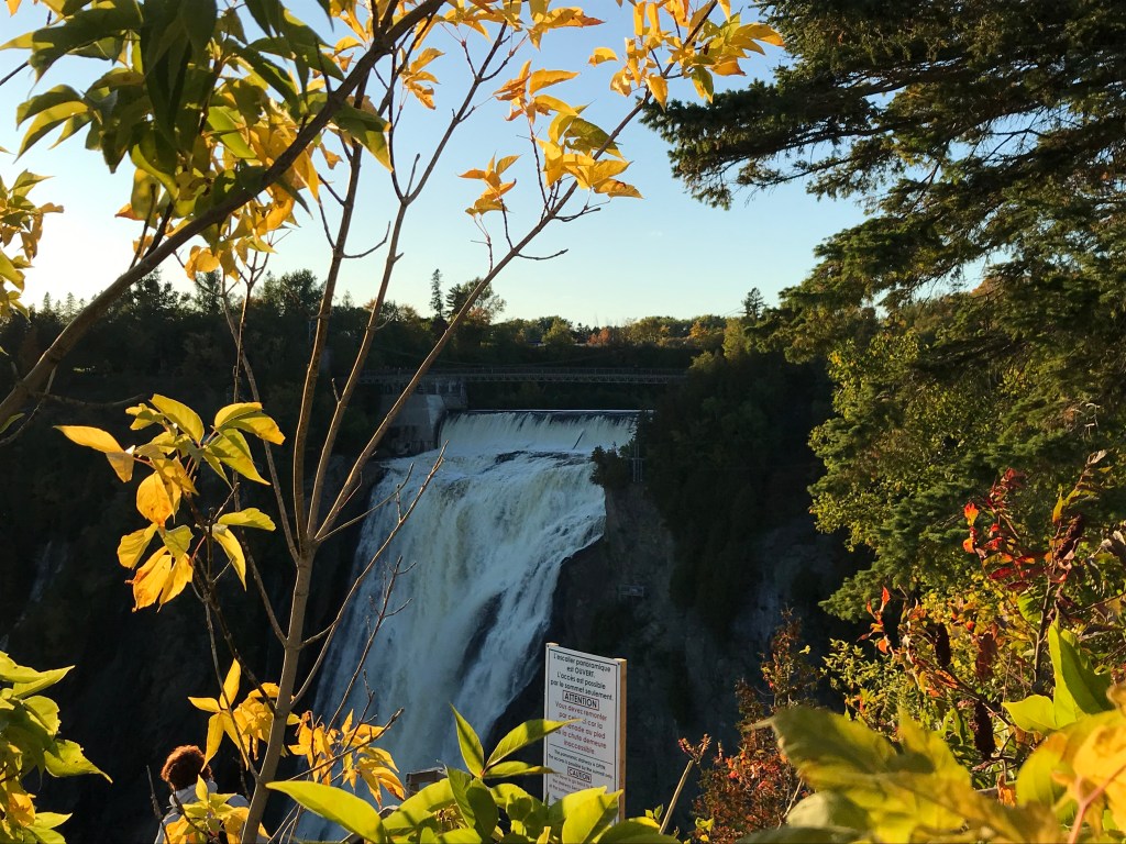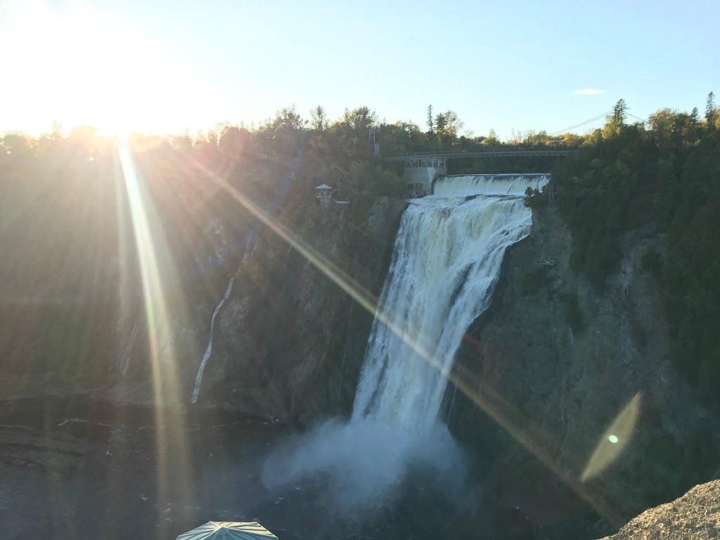 On this lovely sunny day, I encountered two separate public singing performances (one channeling Sister Act complete with spangled robes) and left a happy car to take my space in the now full parking lot. Not far outside the city I stopped off at a waterfall. The Parc de la Chute-Montmorency has a whole tourist ecosystem planned out. From the main parking area there is a gondola ride down to a viewing area at the base of the falls, which costs a bundle but probably gives a good view. I would not know because I am cheap. In season they also have a zip line course which takes you super close over the falls. Yikes.