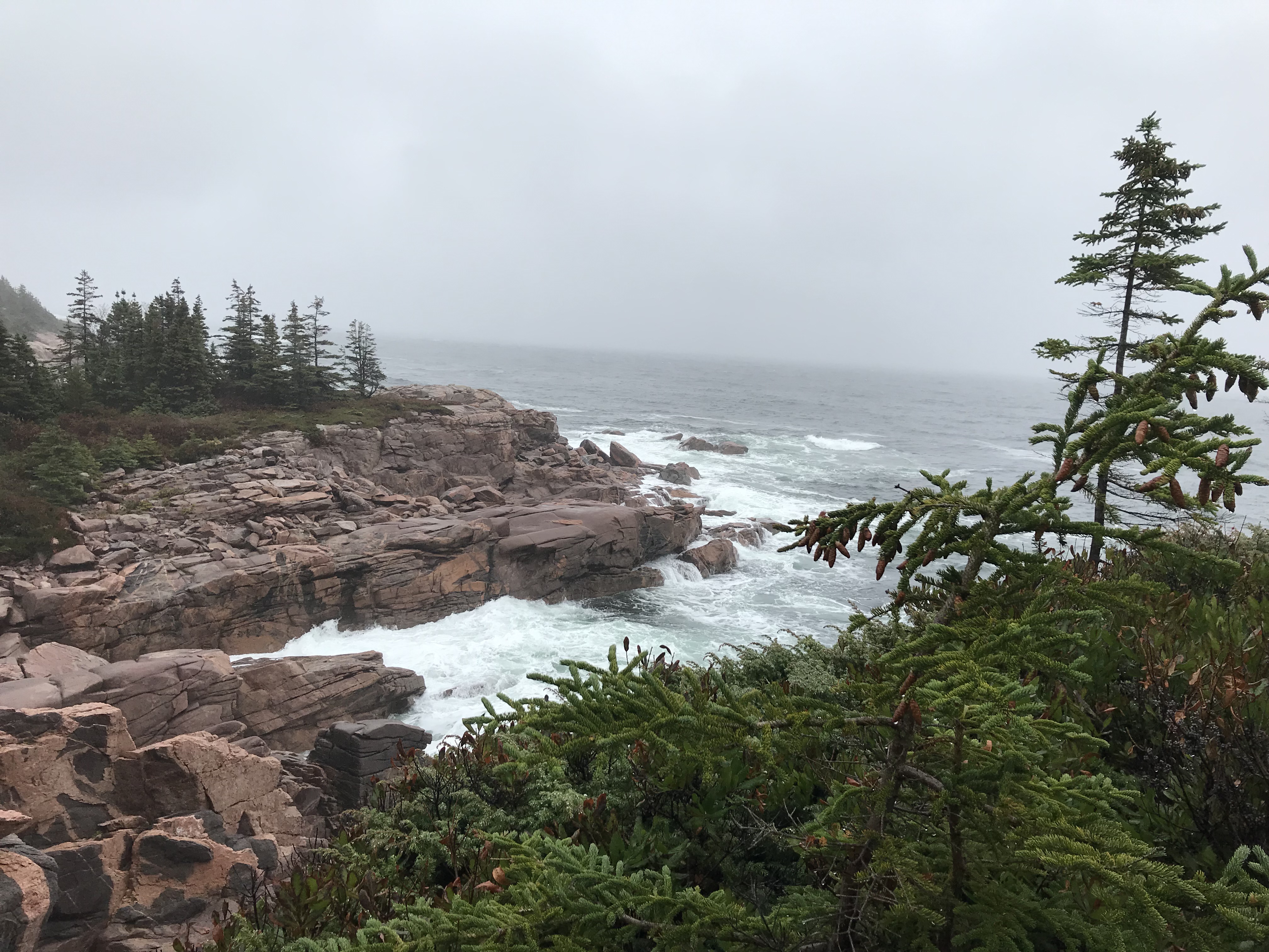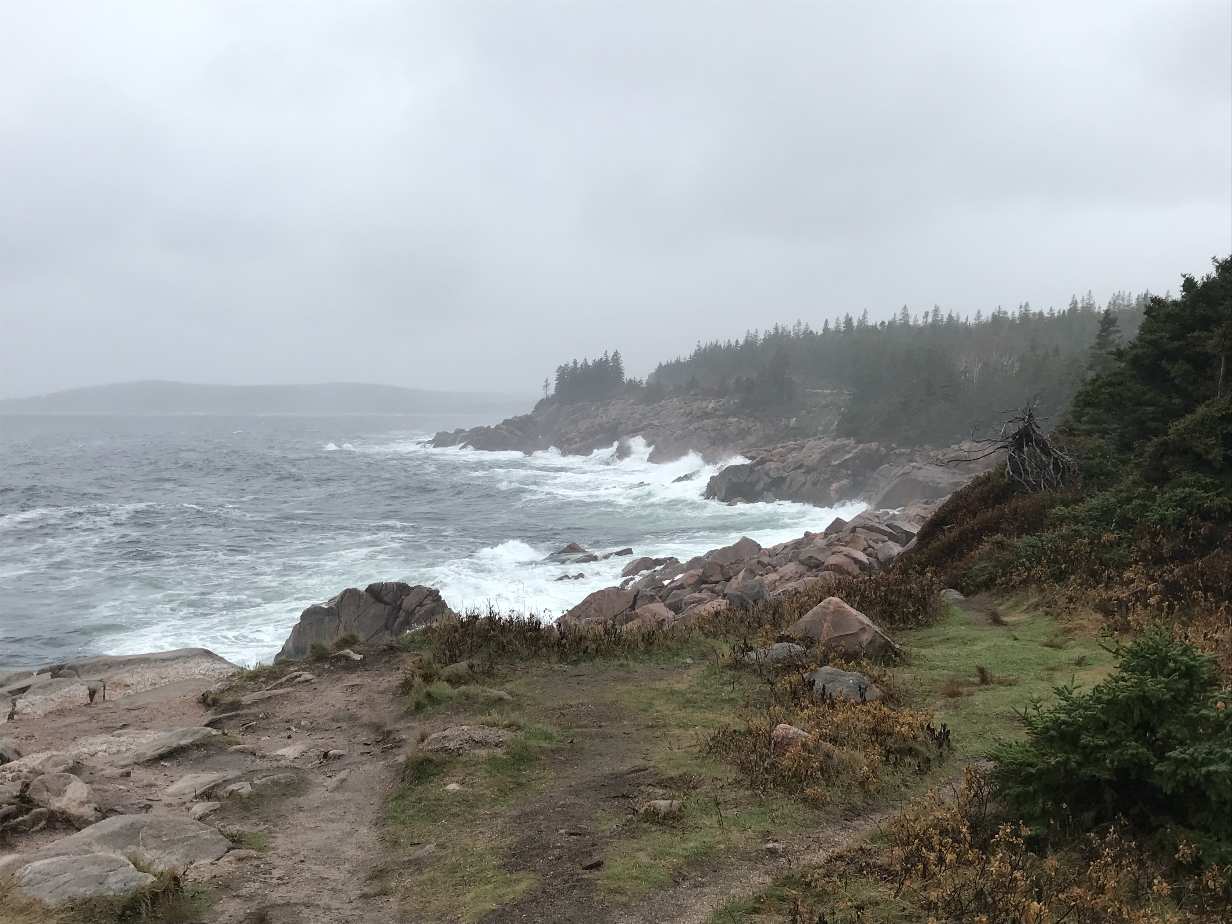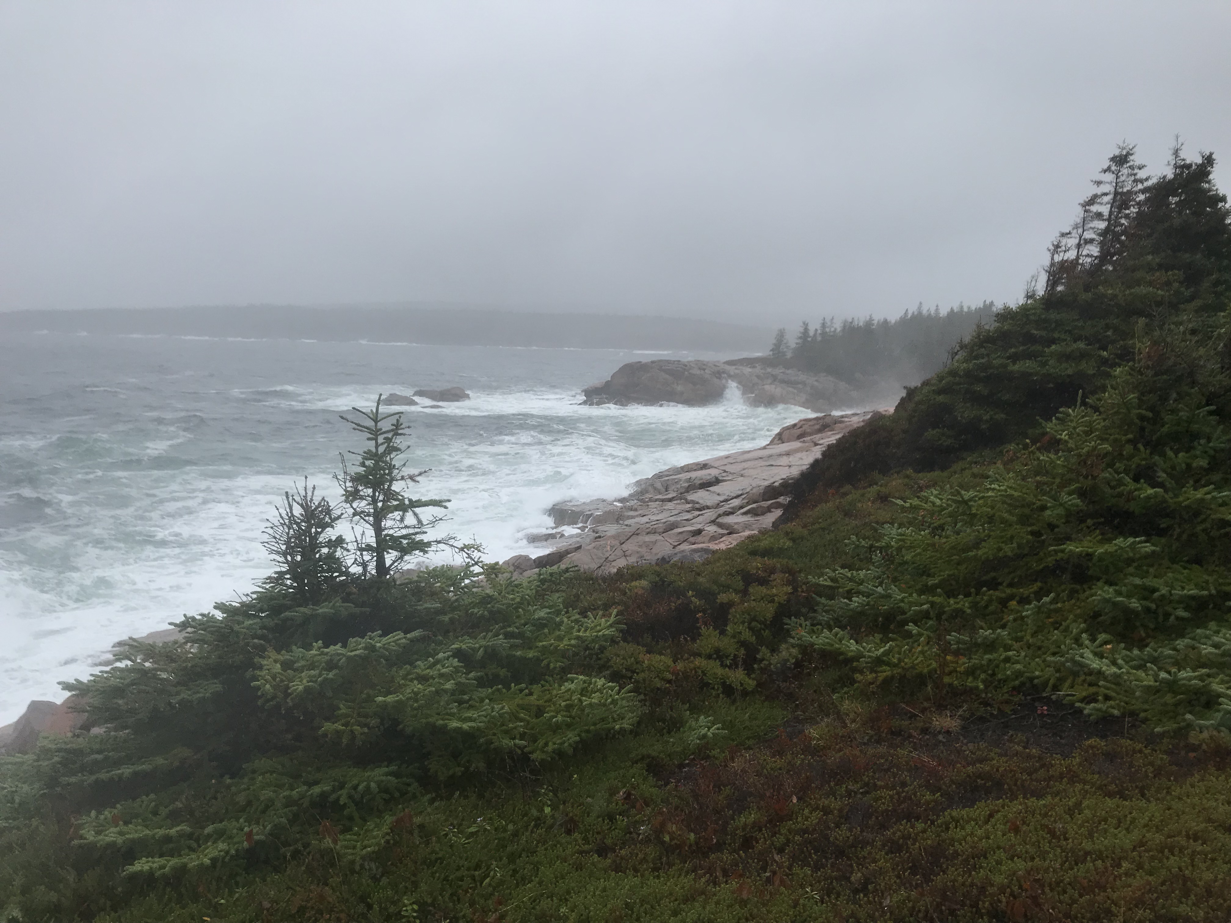 I keep waiting for the day when you’ll be able to record smells because this would be a prime candidate. My senses were on overload here… the smells of the tannin-infused streams, decomposing leaves and logs, and wonderful pine needles gave way to the salty sea air when I approached the coastline. The sounds of calling birds, a lone toad, chattering squirrels, and dripping rain, and later the crashing waves on the rocky shore. The cold wind and wet branches and puddles making me snuggle into my gloves. At one point I found myself narrating aloud, partially as a warning on this misty morning to any bears, coyotes, or moose which call the park home (of which I saw none, but a few traces), and partially just to feel like I was processing this rich experience fully.