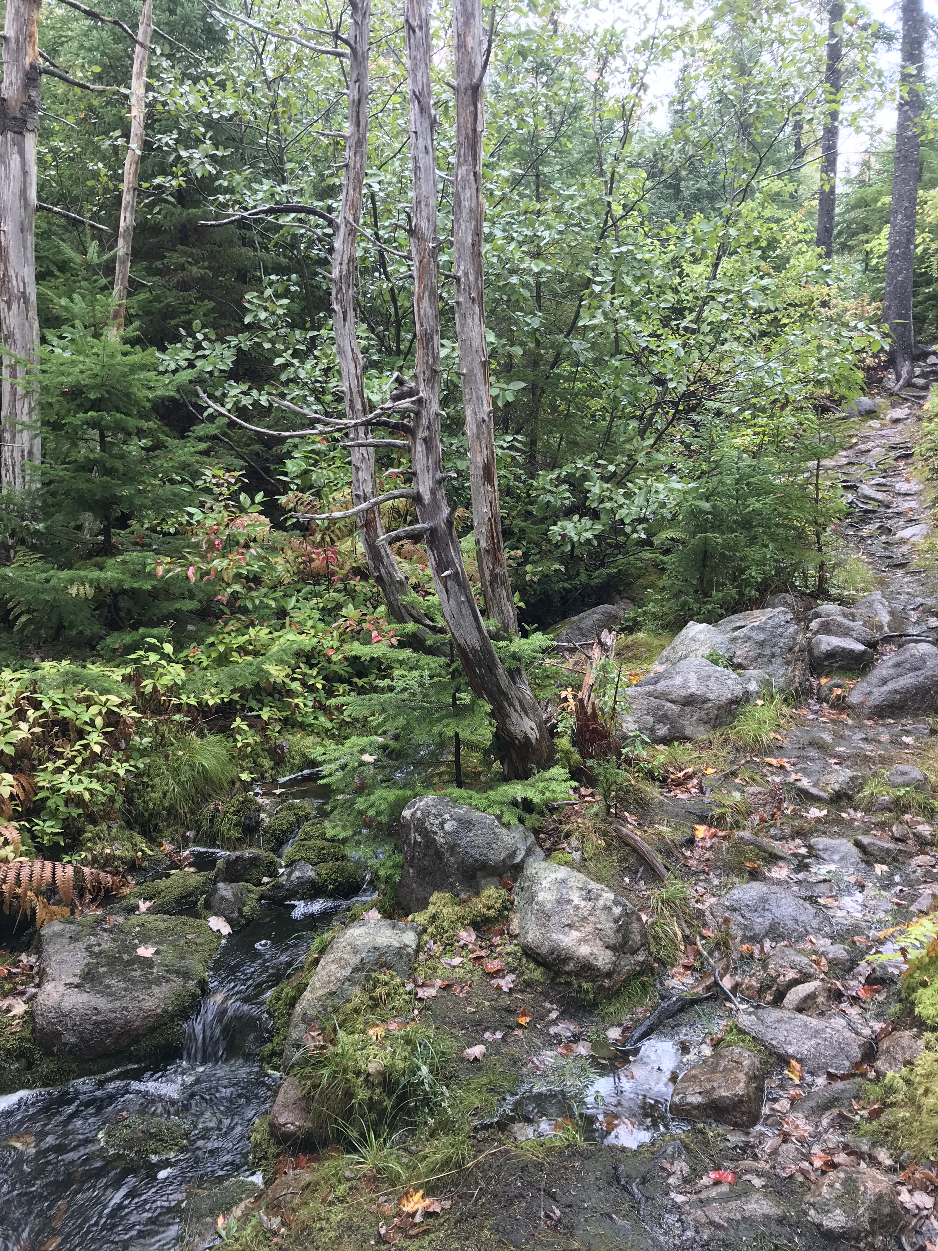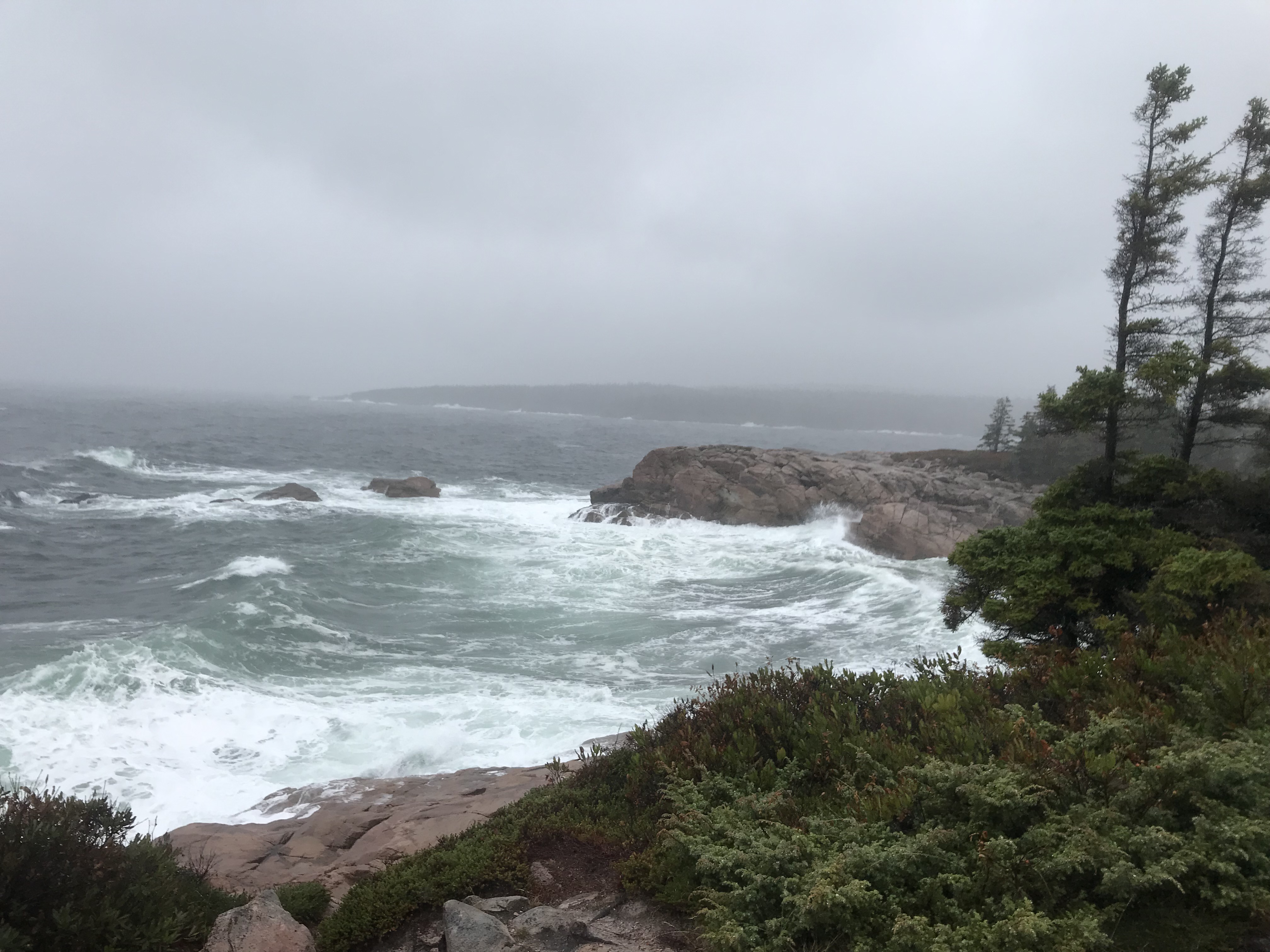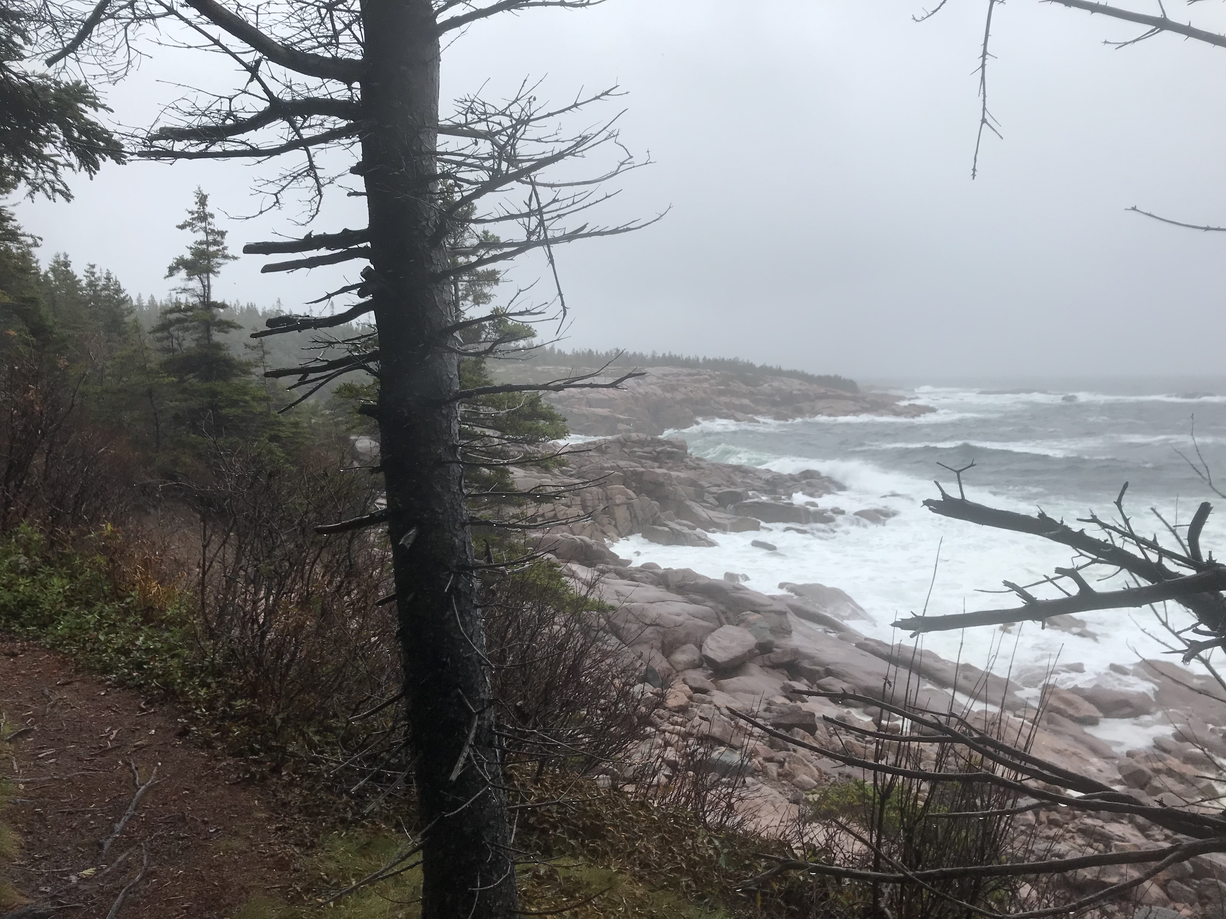 I keep waiting for the day when you’ll be able to record smells because this would be a prime candidate. My senses were on overload here… the smells of the tannin-infused streams, decomposing leaves and logs, and wonderful pine needles gave way to the salty sea air when I approached the coastline. The sounds of calling birds, a lone toad, chattering squirrels, and dripping rain, and later the crashing waves on the rocky shore. The cold wind and wet branches and puddles making me snuggle into my gloves. At one point I found myself narrating aloud, partially as a warning on this misty morning to any bears, coyotes, or moose which call the park home (of which I saw none, but a few traces), and partially just to feel like I was processing this rich experience fully.