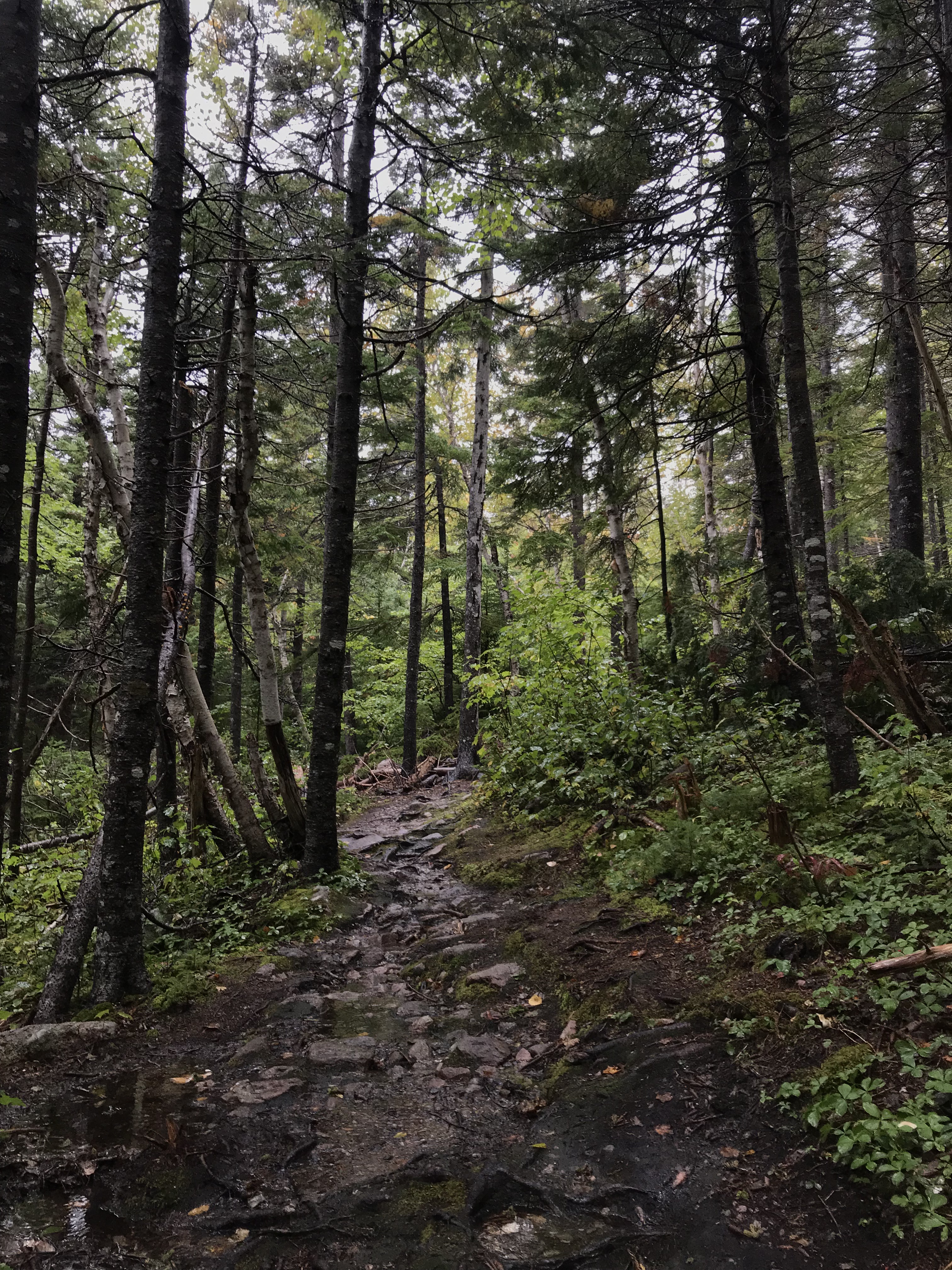 It was rather rainy and dreary my first day in the area, which was not ideal for a place I wanted to explore every inch of park, but just a bump in the road really. I took off to a trail not far from Carole’s within the park which my hosts had recommended as having some interesting plants and views. I was not disappointed. The Jack Pine trail where I started offered nice tree cover which helped with the steady rainfall, and offered ferns, pines, and brooks at every turn. The path had helpful informational signage along the way which explained that these Jack Pines can only grow in certain conditions- their cones only open with intense heat, most often from a fire. This patch of pines are the result of a forest fire some time back.