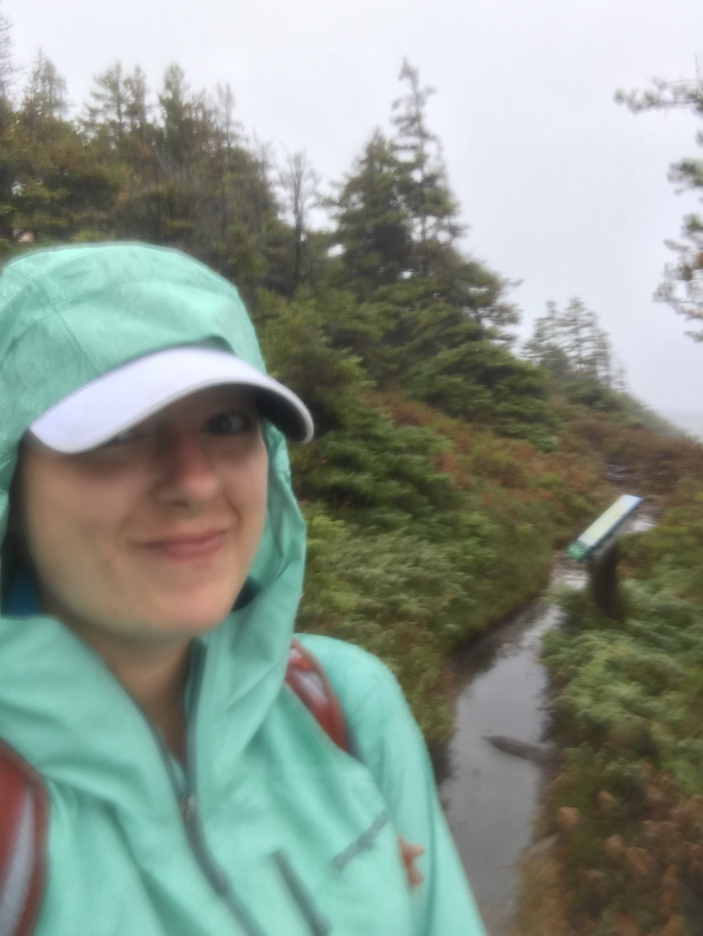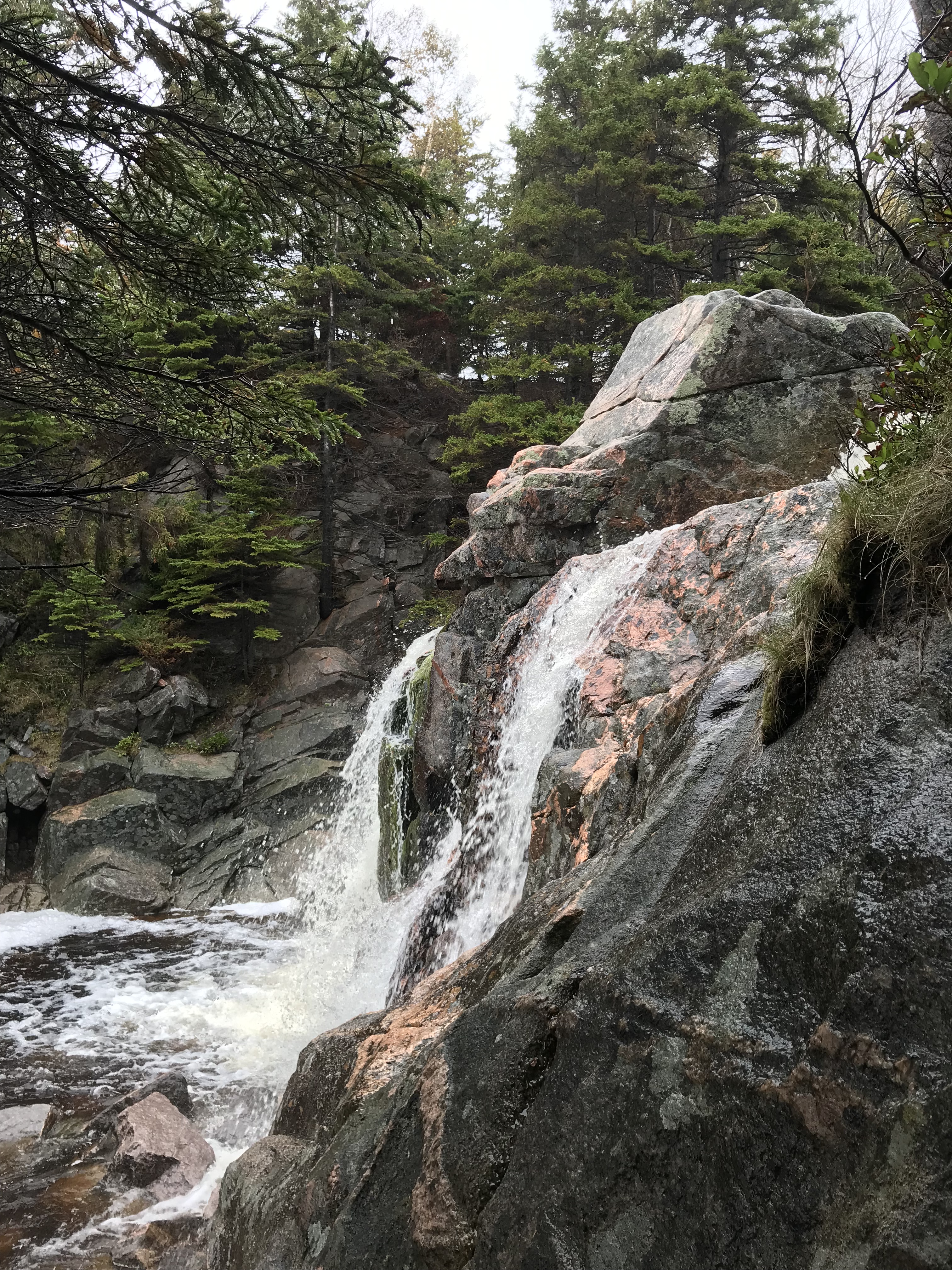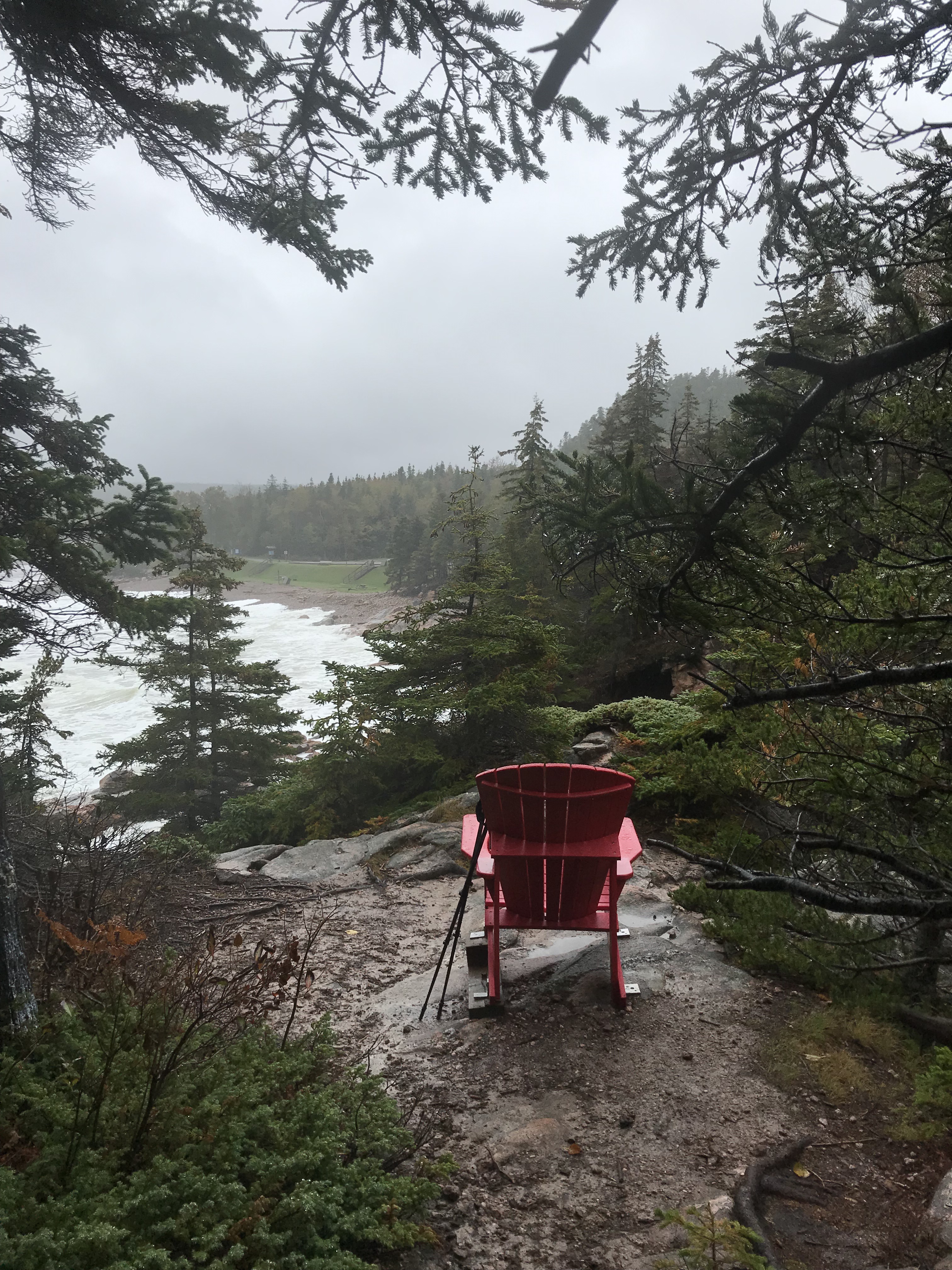 Eventually the Jack Pine trail met up with the coastal trail, which was partially closed but I may have taken a peek anyway. Even on the non-closed portion parts of the path were pure puddle, but luckily the rain had slowed to a drizzle and I could enjoy the views without my hood narrowing my vision. Hooray! Upon one outcropping next to a waterfall back toward the trailhead someone had places a lone Adirondack chair, which I imagine is well used in this lovely spot on drier days.