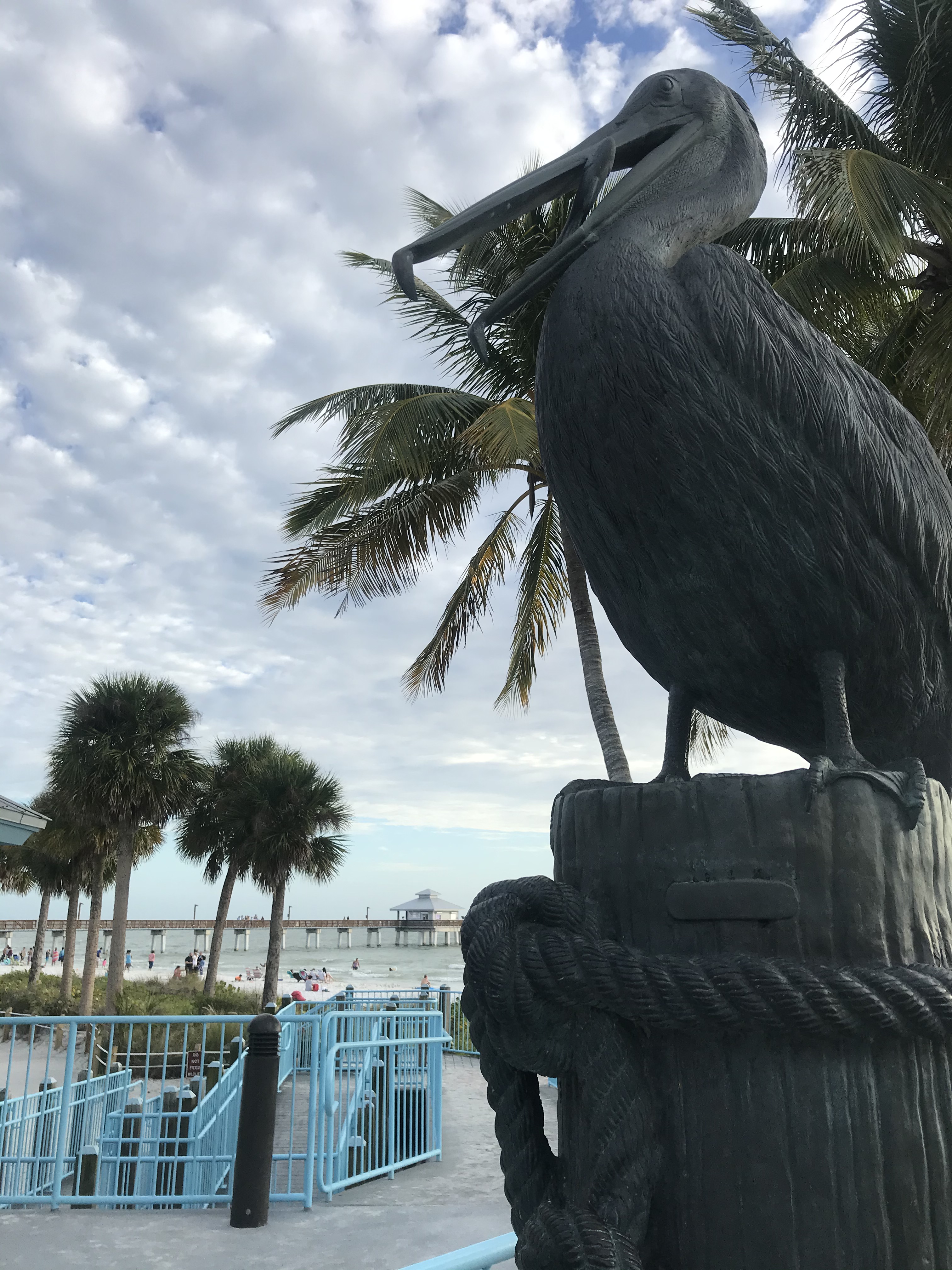 Our friend Pam’s parents were staying in Fort Meyers not for down the road, so we arranged to come by where they were staying and make Pam jealous that we got to hang out with her family without her. To those in the know, this was what we call a PWOP (party without Pam) and of course we sent her many photos of getting to be substitute children. Steve and Julie gave us the tour around town by the beach and we had a drink with our feet in the water while the people next to us played some fun music, smoked cigars and had their pirate mascot out by the beach. So random. I of course never turn down the opportunity to take ridiculous touristy photos and there were many to be had. We got to meet their friend Sue and her bird and cats, but missed the gator who roams the drainage canal out back which or course popped back out not long after we left.