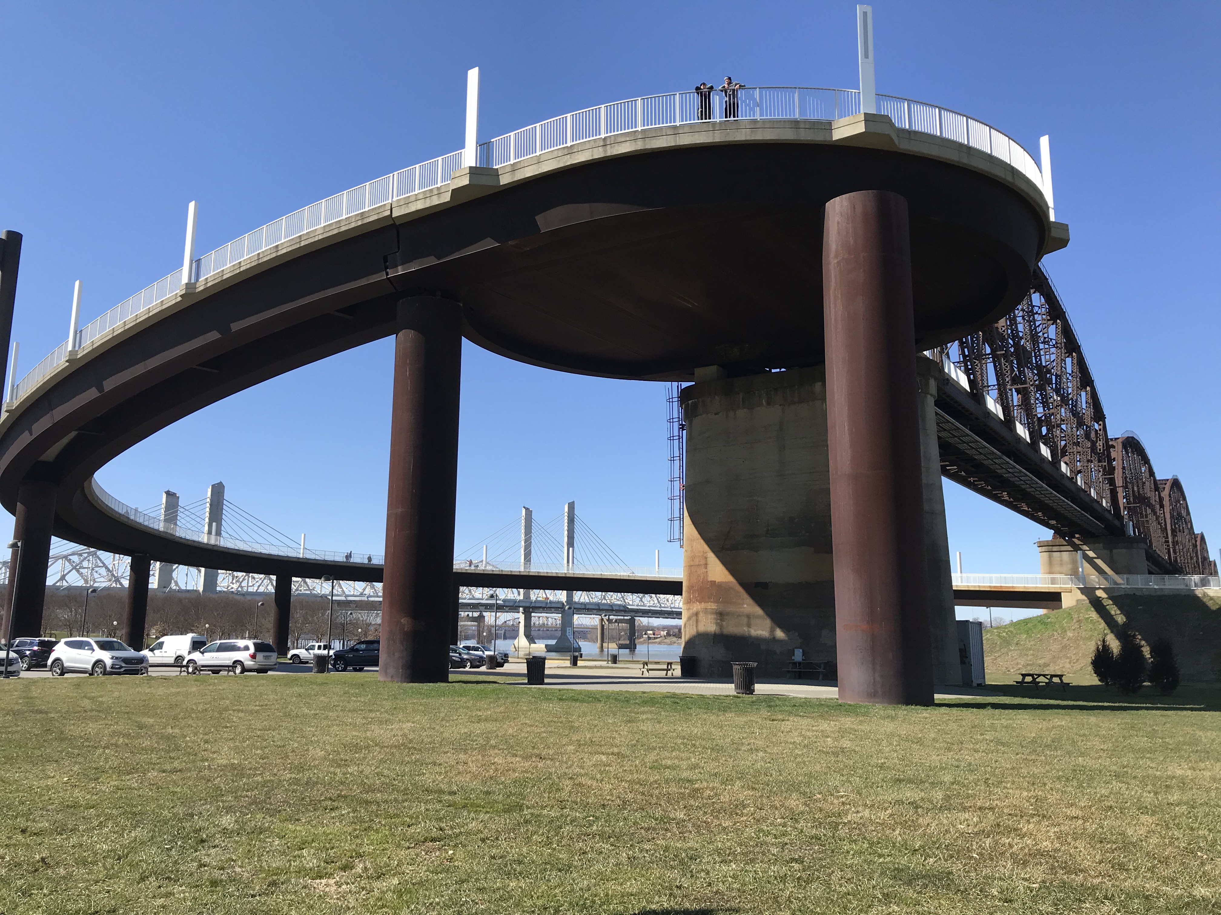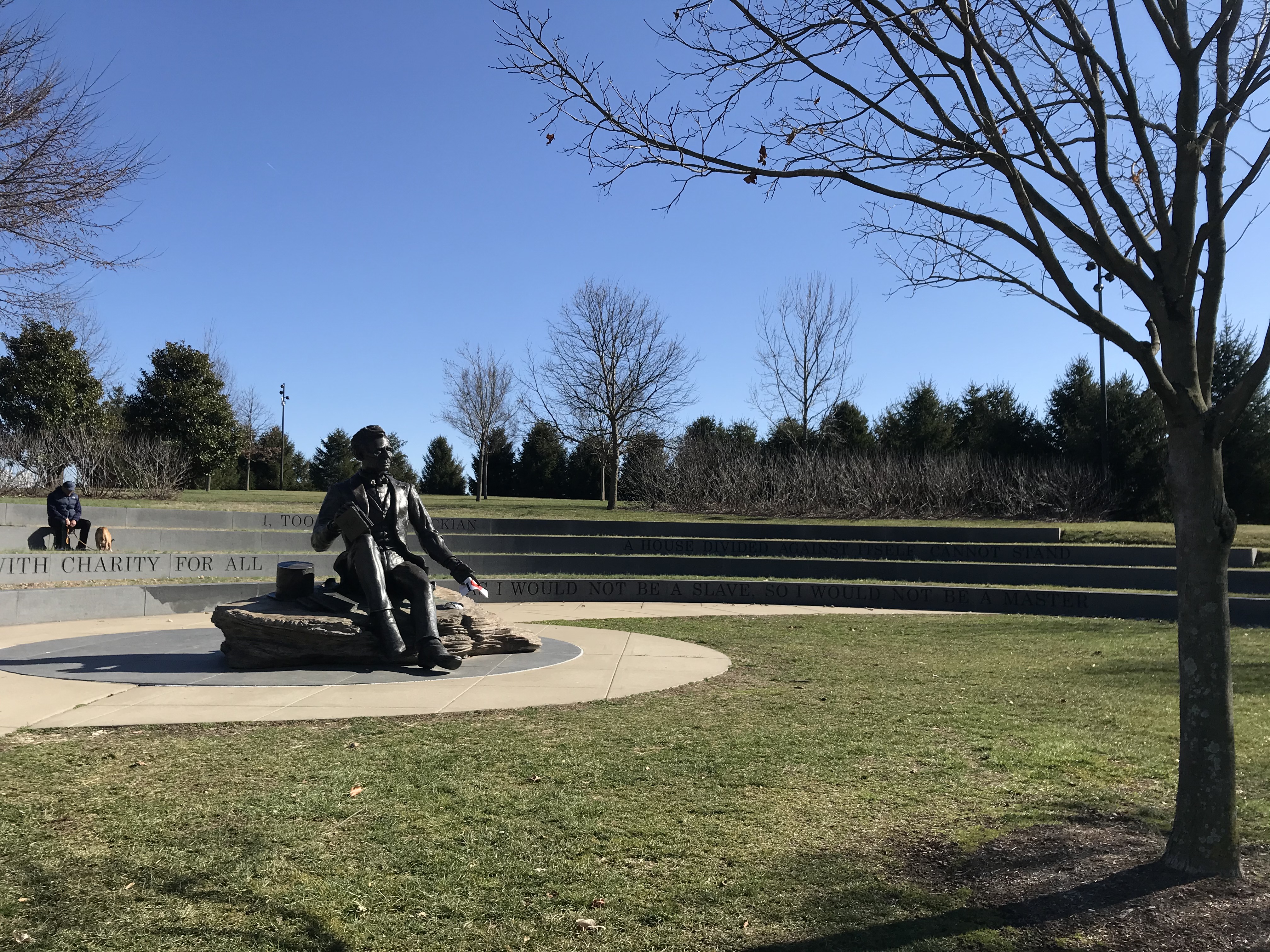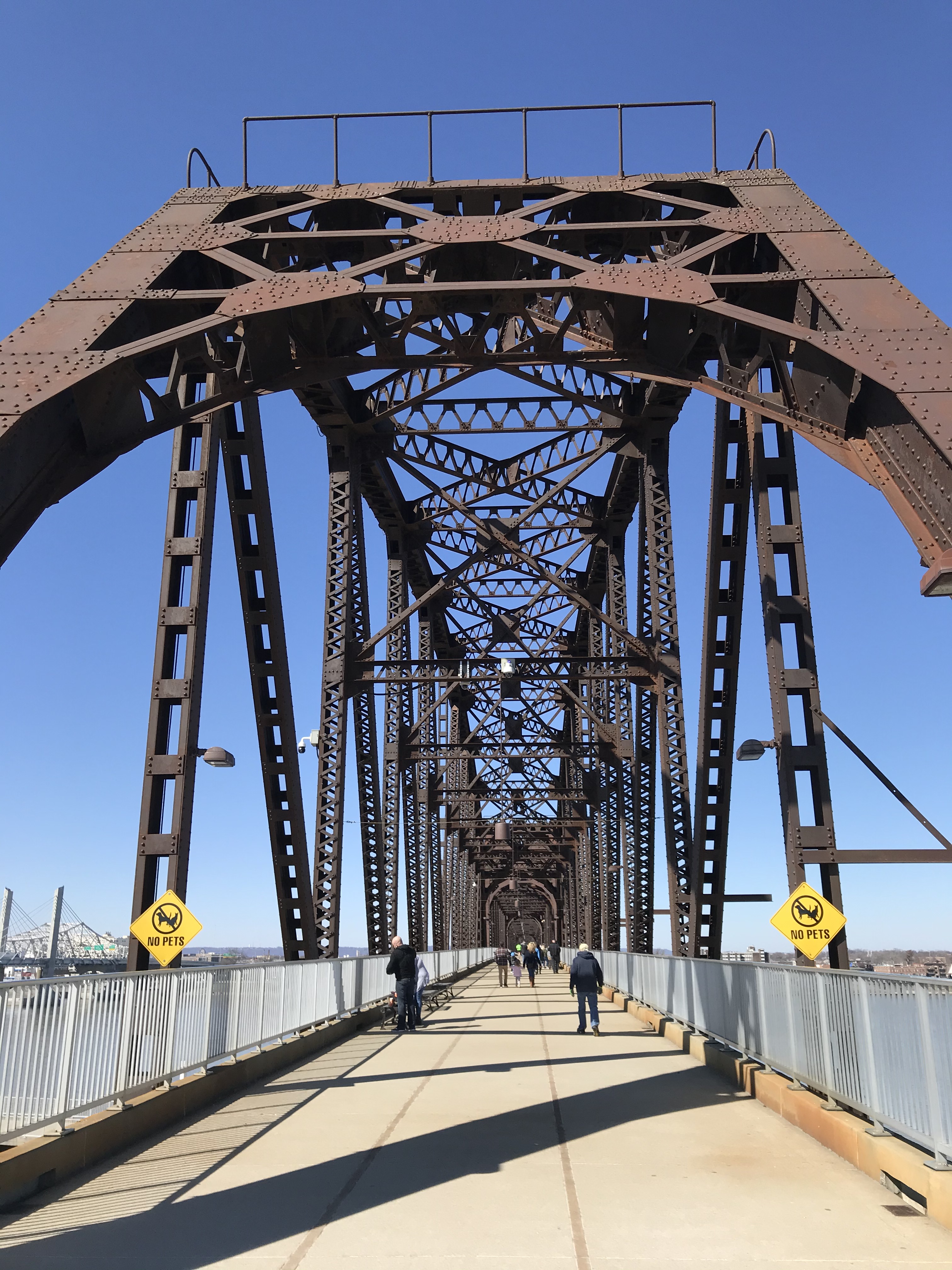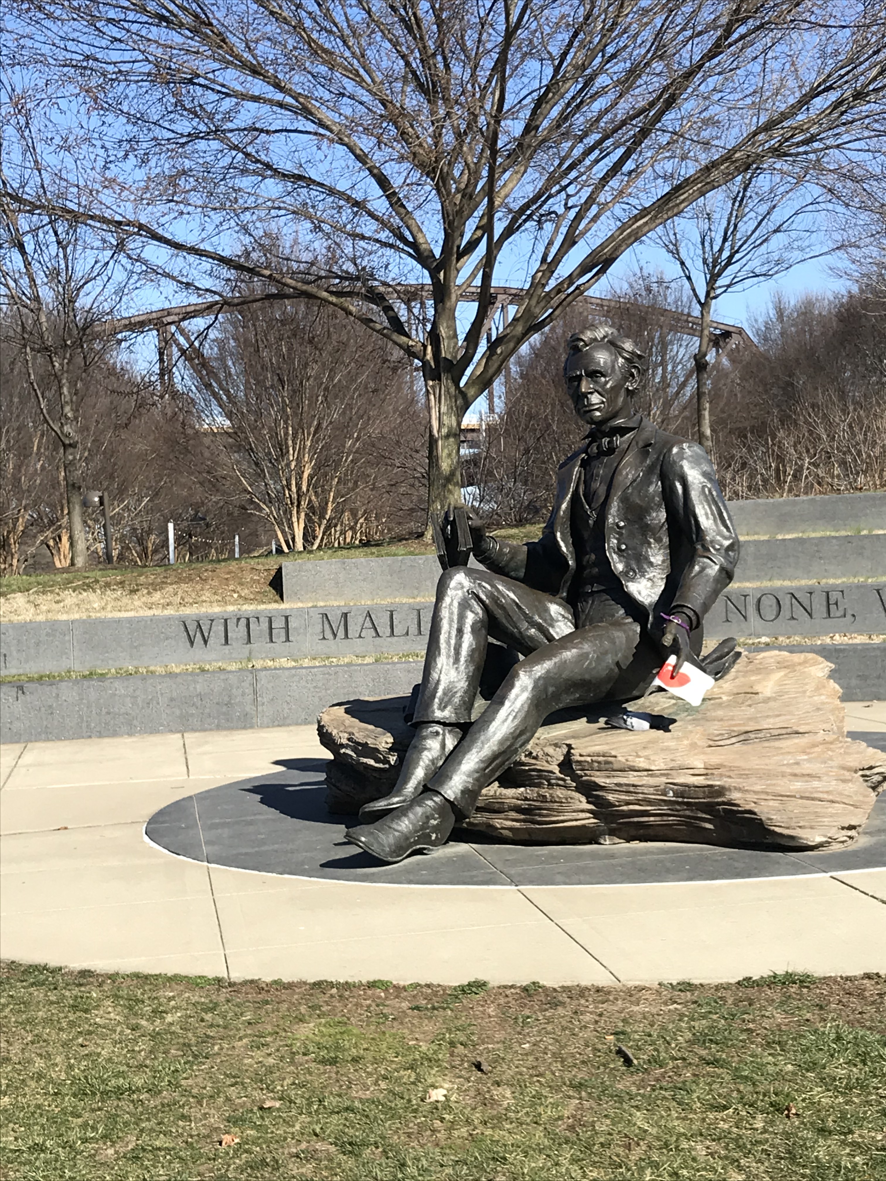 By the riverside I parked and walked across the Big Four Bridge to Indiana- my first steps in that state as far as I know. Had a coffee, saw a house with a bunch of pig decorations in the yard, headed back, and on the Kentucky side walked around the park a little before heading out. There’s a statue of Lincoln sitting by the river, with a plaque explaining that Lincoln (whose wife was from the area) would come here, and sit and watch as the ships transported slaves, solidifying his aversion to the institution. A moving sculpture, tarnished unfortunately by someone having places a dead pigeon next to him and a paper sign in his hand. Pretty disgraceful. Aside from that, Louisville was an awesome place!