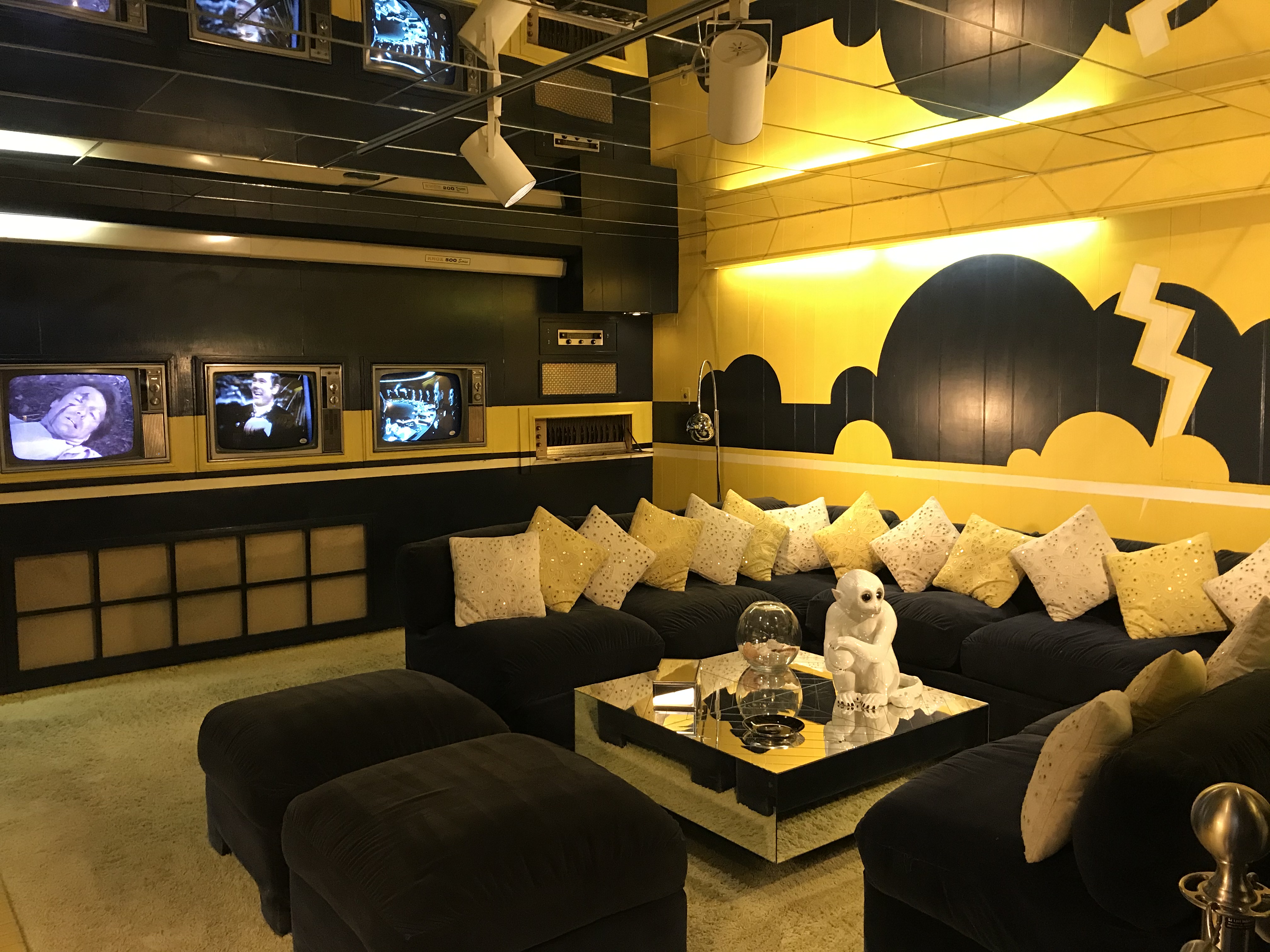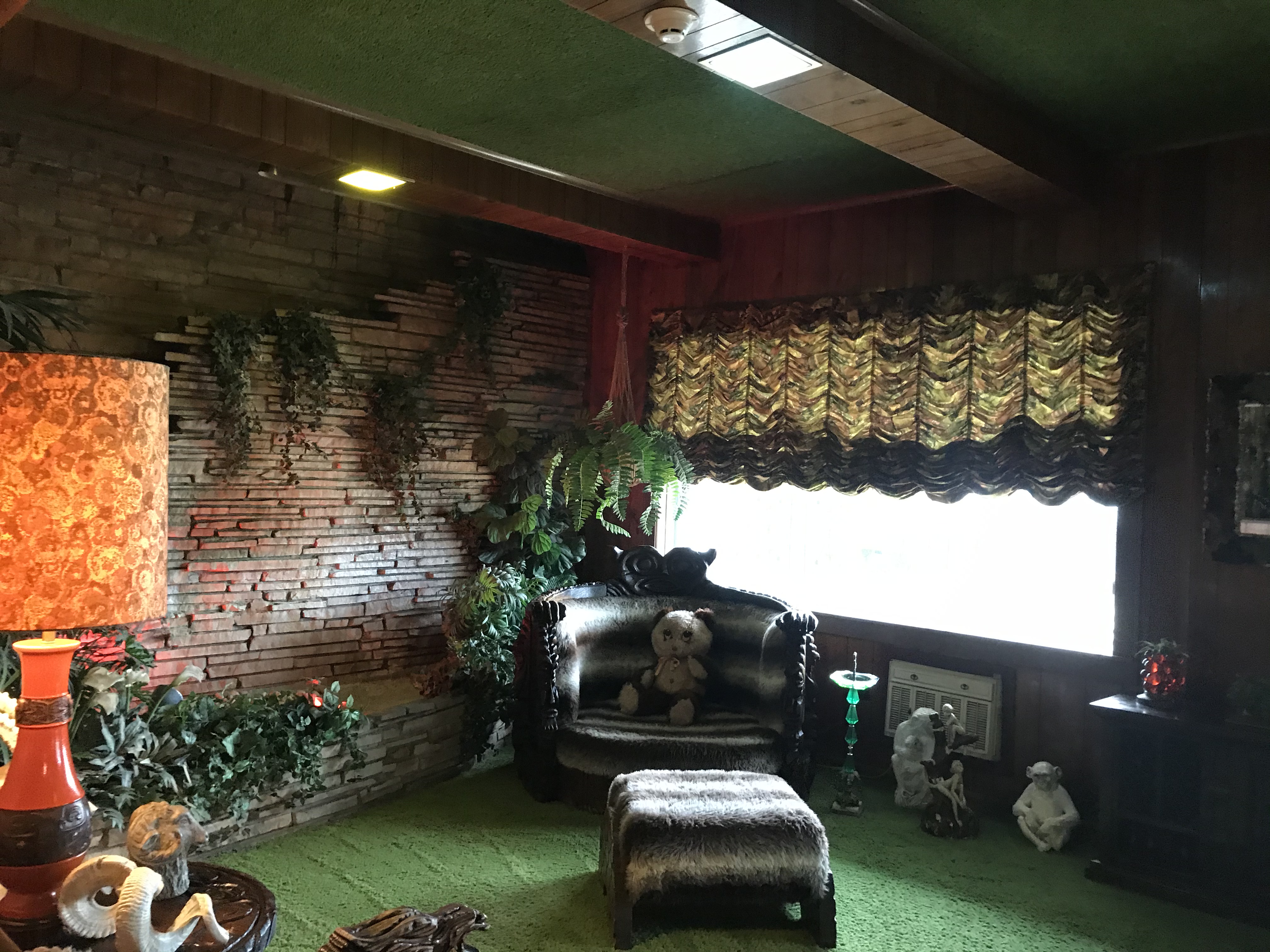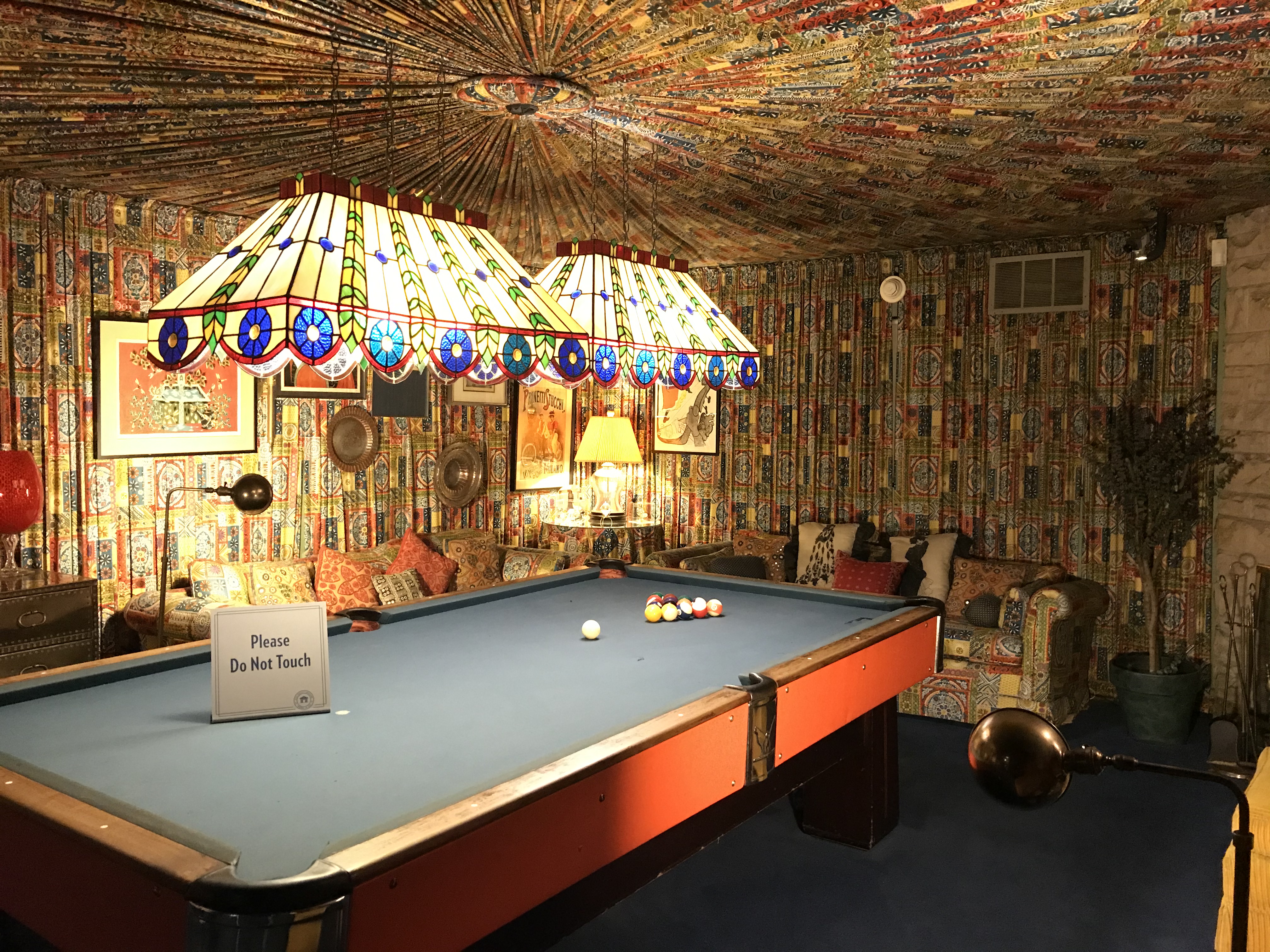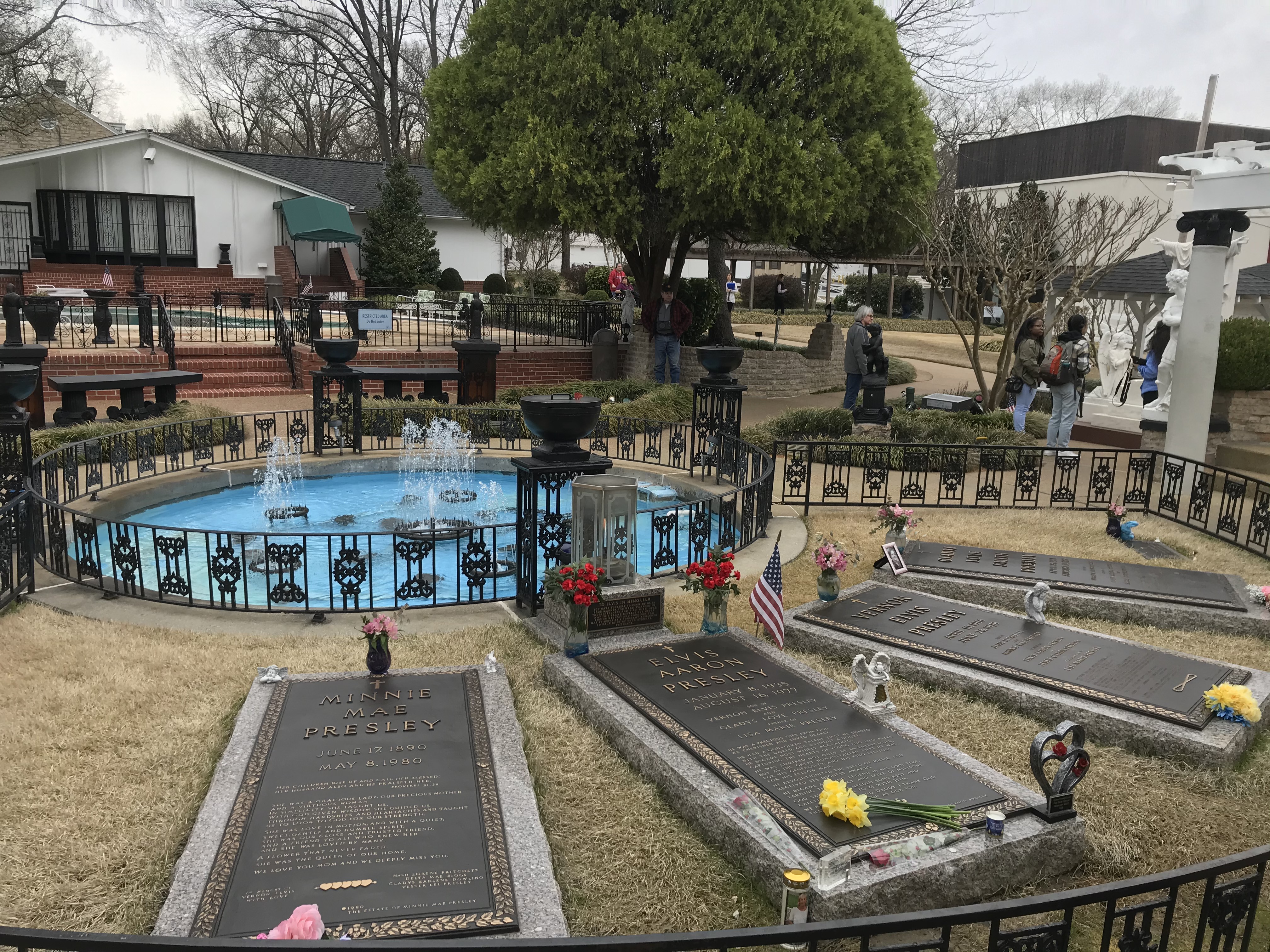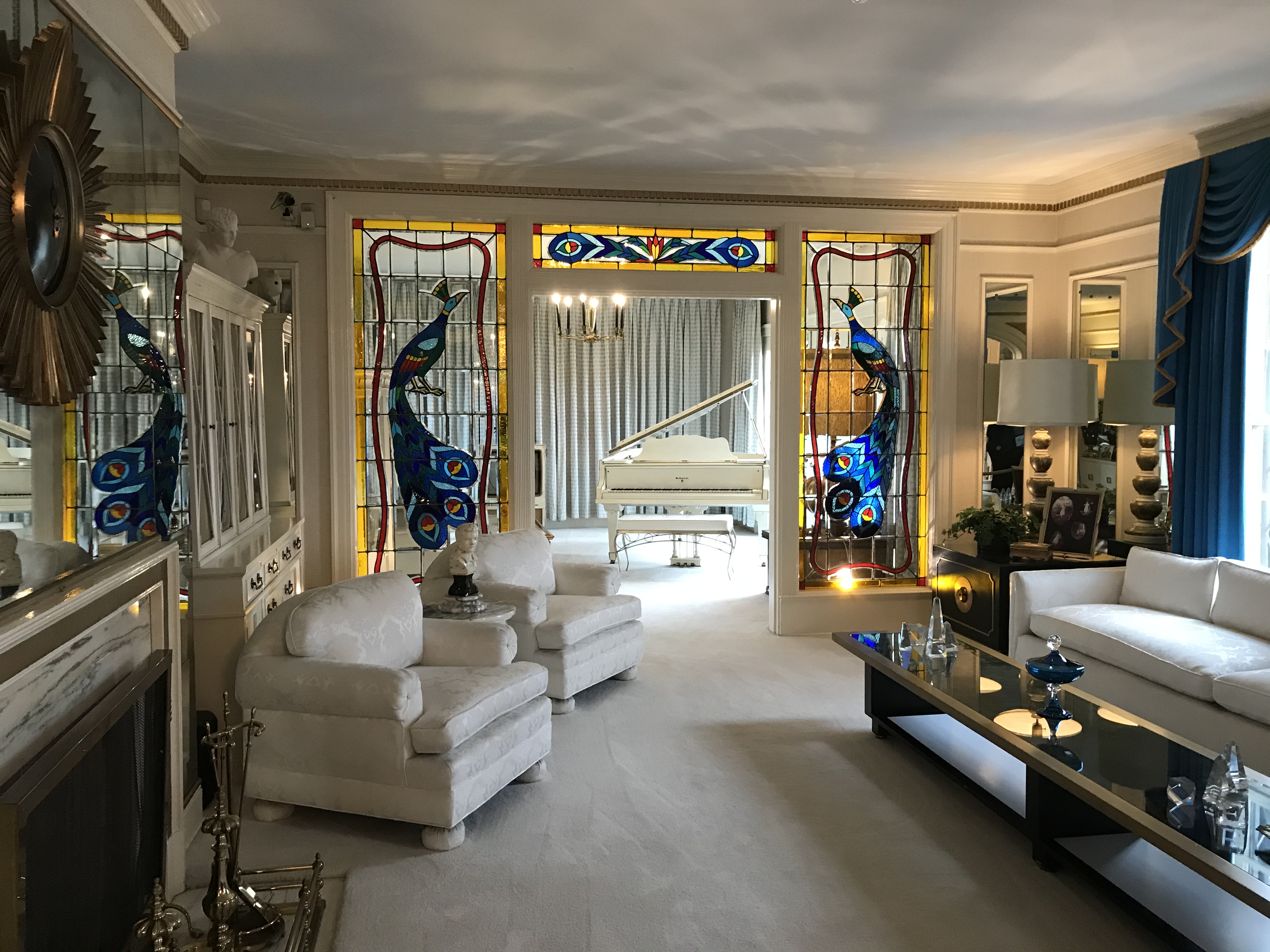 The mansion was super out of control in the funky decor department. Jungle room with tiki masks and a waterfall? White 10′ leather couch with peacock stained glass? Wall o’ tvs? Game room that looks like a crazy fabric circus tent? Hall of mirrors staircase? Horses and go karts? All yes. The mansion tour ends at the memorial grave area by the pool, and there was for sure a grown man tearing up humming a song to himself. People have covered the brick wall outside Graceland with handwritten messages, too.