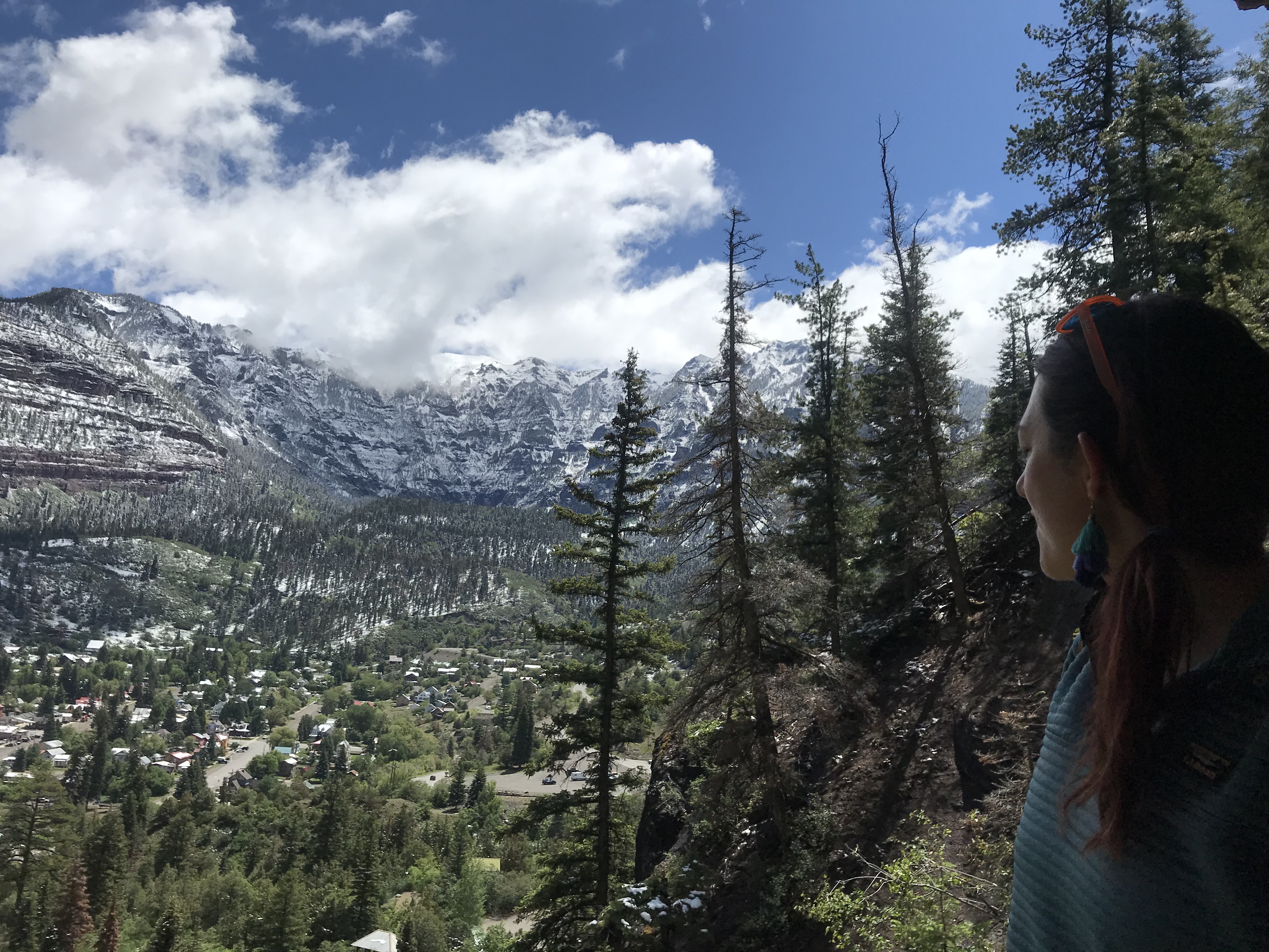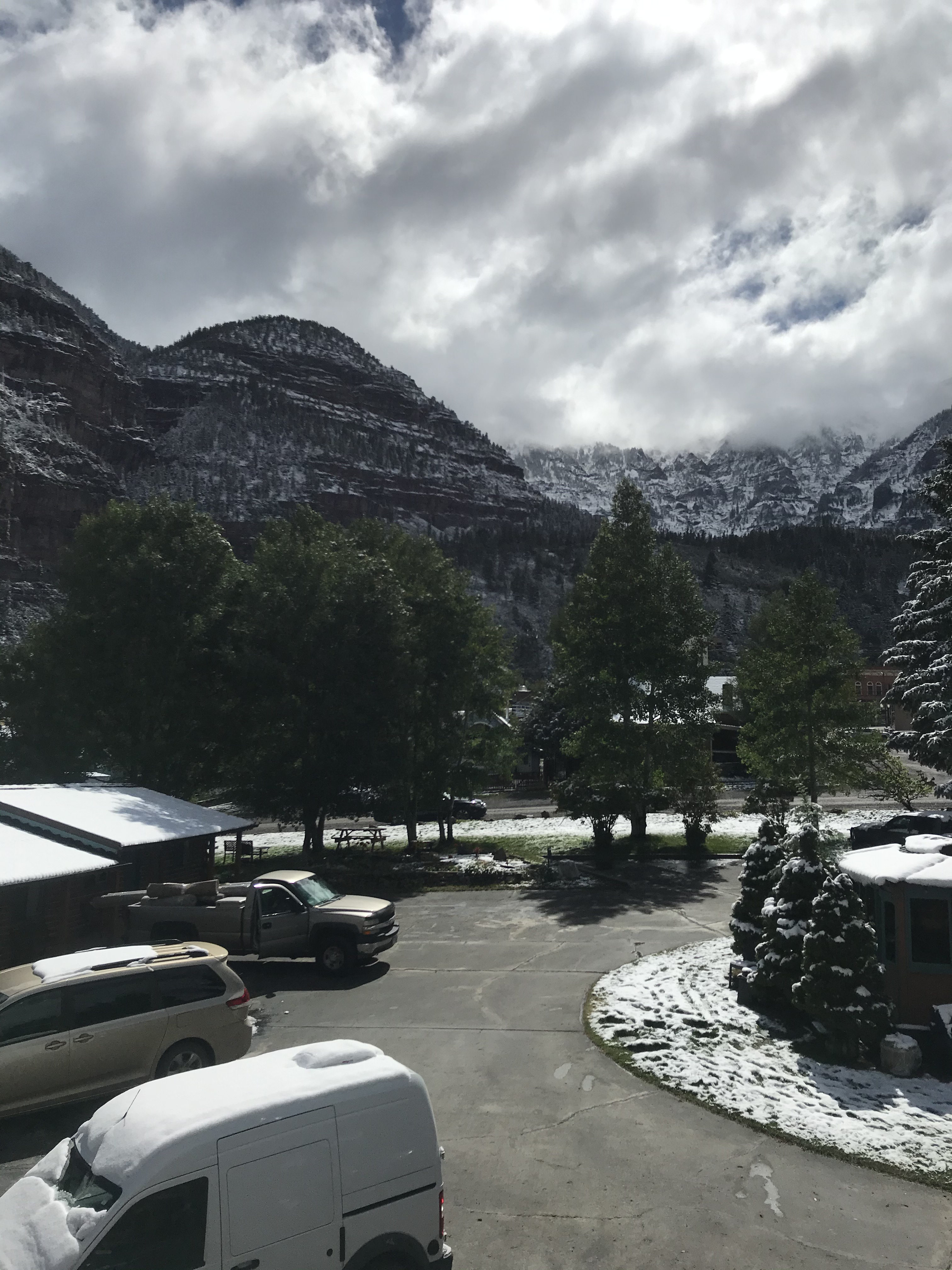 While we were in Telluride I overheard a man on his phone saying something like “well it’s not supposed to start coming down until around 6″, put two and two together to check the weather, and sure enough it was going to snow. 3-9” in the mountains above 10,000 ft (where we’d been the night before). In June. Now, the van is not so great in the snow with it’s dinky engine, 2 wheel drive, and being so heavy with all my junk in it, so this revelation put the brakes on our previously held idea to find some camping outside town that night and maybe have to navigate winding, narrow, steep forest service roads. On to plan b, which was to spring for a hotel in the smaller town of Ouray up the road. Shower, actual bed, and not having to pack up a snowy or rainy tent was well worth it.