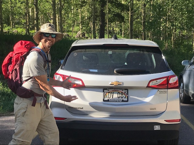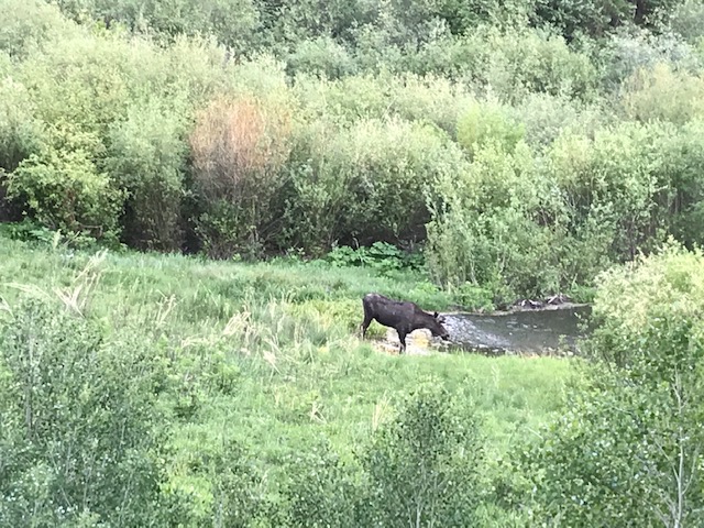 On our way to the campsite, not one but two amazing things occurred that I’d been begging the universe to provide: 1) we found a Hawaii license plate to finally end the license plate game I’d been playing since January, and 2) we saw my first ever moose drinking from a stream below the road! What a day! Plus we had a fantastic campsite close to the stream hidden amongst the aspens and pines, and lucked into having more fun neighbors who donated extra camp wood for our fire and joined us for a while. I think it helped that I had seltzer and cups to go with the mother’s (of the mom and daughter duo neighbors) tequila and limes.