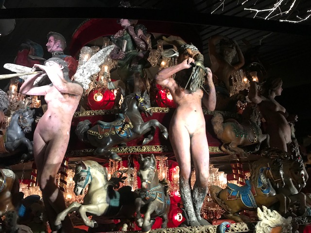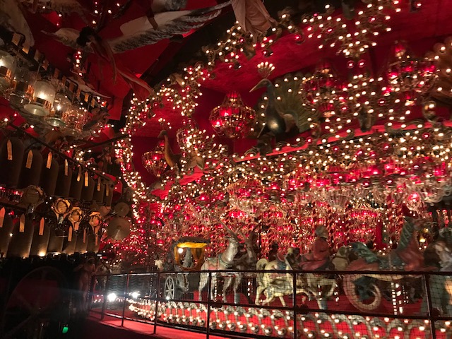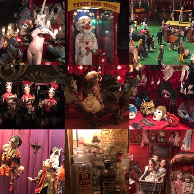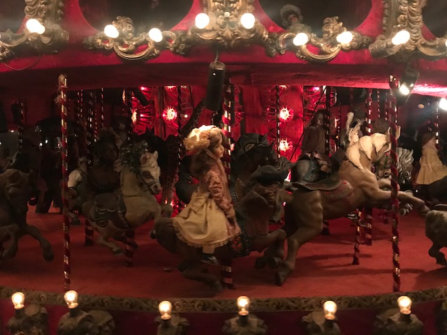 Further on are displays of creepy dolls, masks, dioramas of circuses with teensy figurines, dollhouses, windup toys, and all kinds of knickknacks. There are huge rooms filled with themes like air travel in history, sea-related items, trains, a working carousel (not open for rides I was sad to find), a creepy doll carousel with bizarre half-human figurines adorning the top, and all kinds of giant displays and creations. Scattered throughout were all these automated music scenes (think an orchestra made of mermaids and sea creatures) and little carnival game type things that you needed to buy tokens to operate. I was of course not about spending extra money for that, but lucky for me a few other groups ahead of me were into it so I caught glimpses of them in action. The whole thing was super weird, but totally entertaining and worth whatever bizarre nightmares might come in the aftermath.