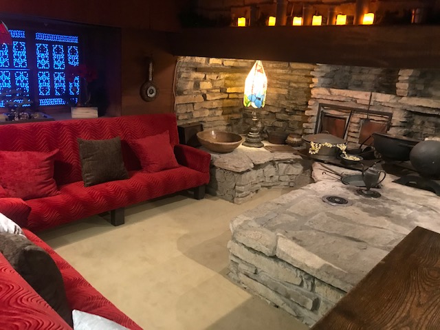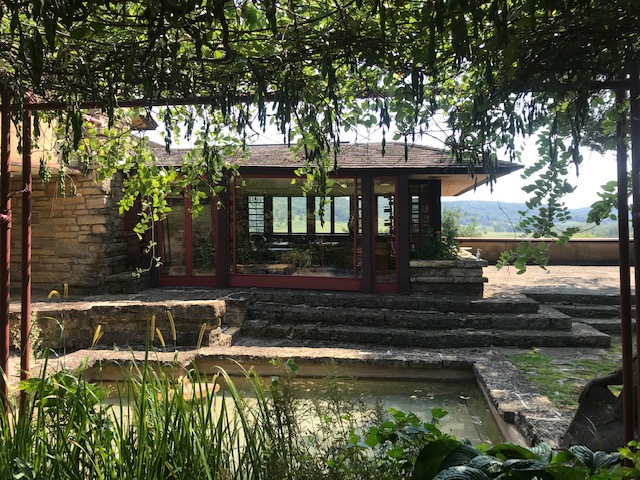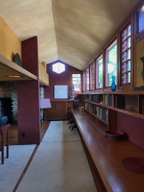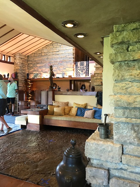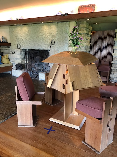 Anyway, after a night in my van down by the river, I had a beautiful day for a tour of Taliesin with a small group of masked up folks. The tour I took (not the most extensive option) went through the architectural school, which was originally a school run by Wright’s two aunts, was later redesigned and transformed by the architect. The main drafting room was pretty cool with its sawtooth ceiling and rows of tables with triangular accents and great lighting. The building also has a dining room, music room, theater (under restoration) and I’m sure some things I’ve forgotten. Outside we viewed the windmill named the Romeo and Juliette windmill which powers the well, and seemed to fit perfectly channeling the silos on neighboring farms.