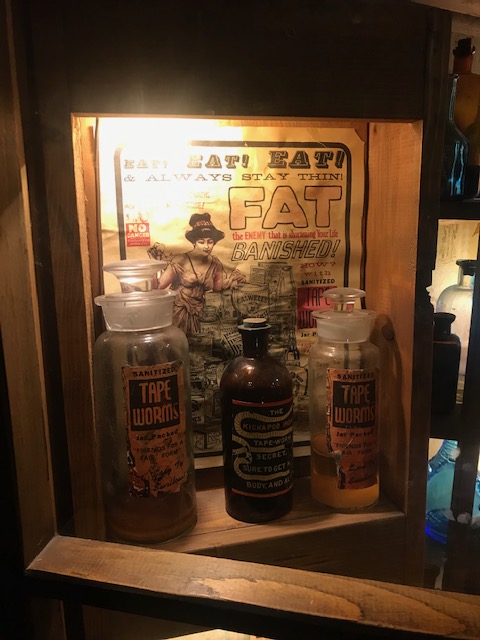 Now this huge additional warehouse area was insanity and was quite possibly even weirder given the limited numbers and distancing in the current time, because it added a semi-deserted, spooky feel to the whole place. A pathway leads visitors through a series of thematic areas beginning with an old-timey town filled with storefronts and homes you can peek into and are filled with kitchy antiques, a lot like a weirder version of Disney’s main street. My favorite was the apothecary for its old poster advertising the health benefits of tapeworms for slimming. Ha!