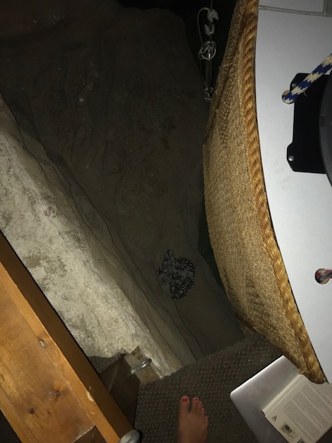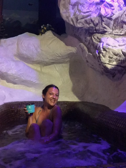 This suite is 2 levels combined and features 3 tvs, multiple crazy rainbow light features, an alpine scene painted on the walls, an in-room jacuzzi bathtub deal with a waterfall feature as the faucet, and of course a hot air balloon spanning a floor and a half made of rainbow fabric and with the bed in the basket and a mirror above the bed. And the basket rocks a little because it’s on a platform and seems to actually use the ropes to help support it? In any case I was for sure not the intended audience as a solo person, but it was hilarious and so much fun to just hang out, eat dinner, drink some box wine in the jacuzzi, and sleep in this crazy bed. Did I manage to drop my pajama shorts down the gap between the basket and wall? Sure did. So I added rock climbing to the list of features this room has to offer and climbed down the 6′ or so to retrieve them and then back up the faux-rocks (maybe made at the FAST factory??). What an experience. Everyone should go and see this fun if ever you’re passing through this area.