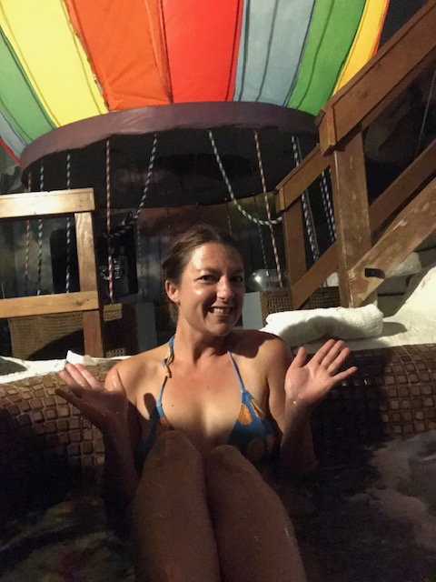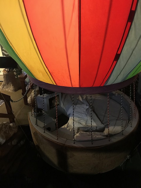 The lobby has a circle of old barber chairs around a fire pit kind of thing, and the motel has a pool that connects the indoor and outdoor sections with a swim-through canal and a sort of doggie door made of that carwash plastic draping. After a hot and humid few days the cool pool was great. The best part, though, was the room. Now I’d been tempted by the rooms with themes like a moon landing, an igloo, a jungle, a tipi, the list keeps going (seriously, check it out to see photos of these choices), but I am so pleased that I ultimately settled upon the hot air balloon room.