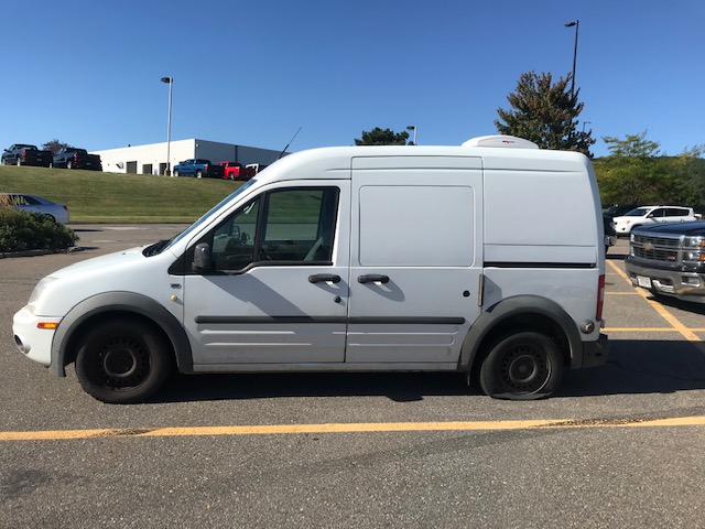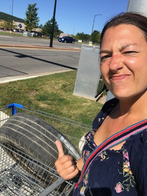 Fantastic. So, plan B- I grabbed a Walmart shopping cart, tossed the spare in, and wheeled it across the highway to tire shop number 1. They were very kind and refilled it for me, and upon my urging tested it for leaks using the tried and true spray bottle of soapy water method (thanks, Phelps aquaglide crew flor teaching me this) to identify an unpatchable hole, but one we thought would hole at least for as long as it would take to get this tire on the car and it over to see what gives with the super flat one on there now. Now, I live in a busted looking van, and am acclimated to looking mildly homeless as thus, but wheeling a shopping cart with a tire and being all gross and dirty as a result really added to my image.
