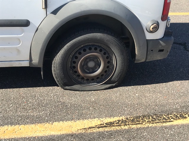 Come morning that sucker was flat as a pancake, enough that I wondered why I felt off balance in bed when I awakened. Oops. Luckily I was parked in a Walmart lot in a small city and conveniently directly across from not one, but two tire shops that were open upon this discovery at 8am. No problem, thought I, I’lljust plop on the spare, drive across the street, see if I can get this one patched, and be off.