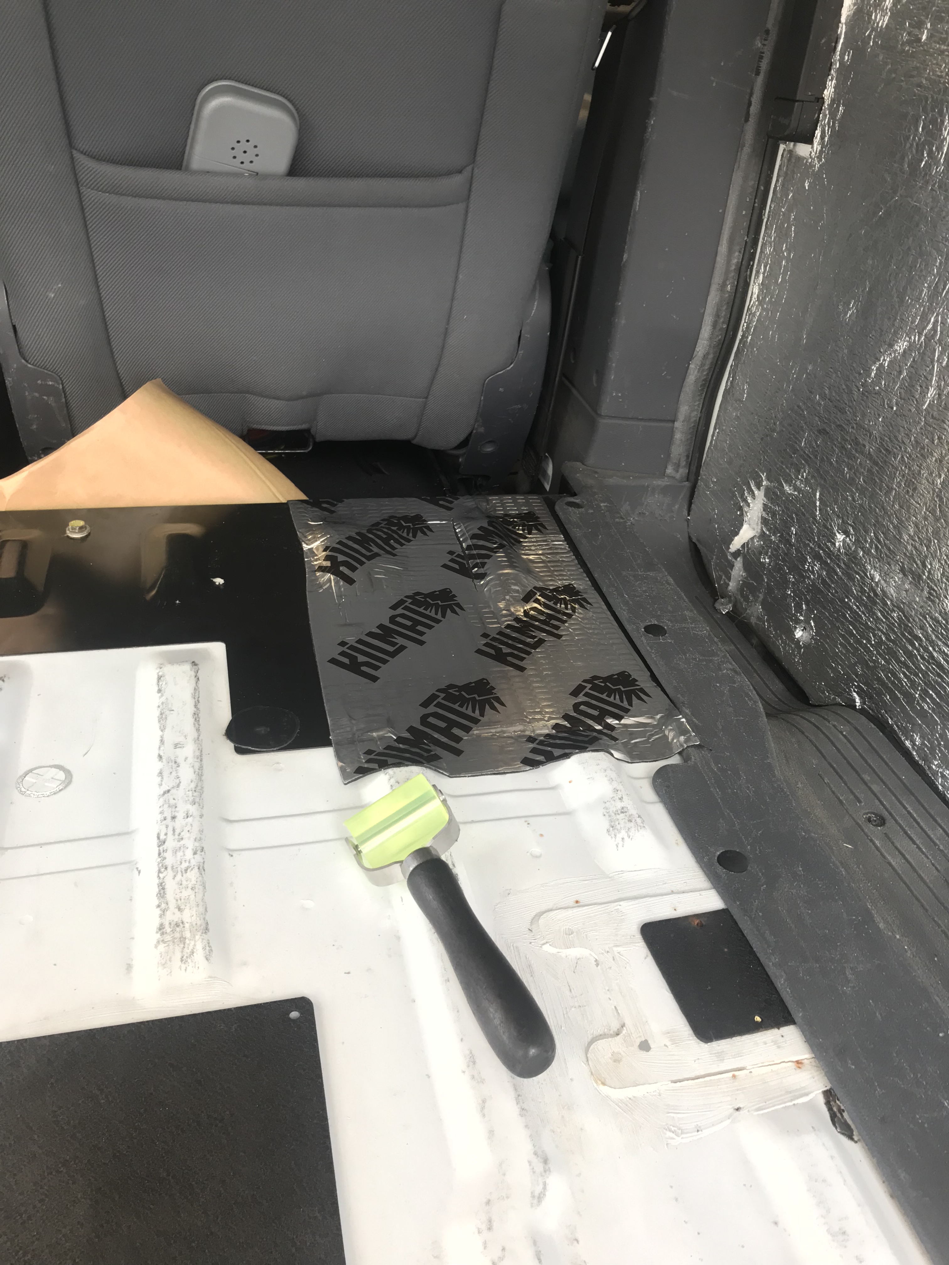After some forum/blog/you tube searching, I decided to order some Kilmat sound deadener material from Amazon. To install it, according to the directions and you tube, I stuck it down to the van floor and used a little roller I had to purchase separately to roll down the quilted pattern which indicates it’s pressed down firmly enough.