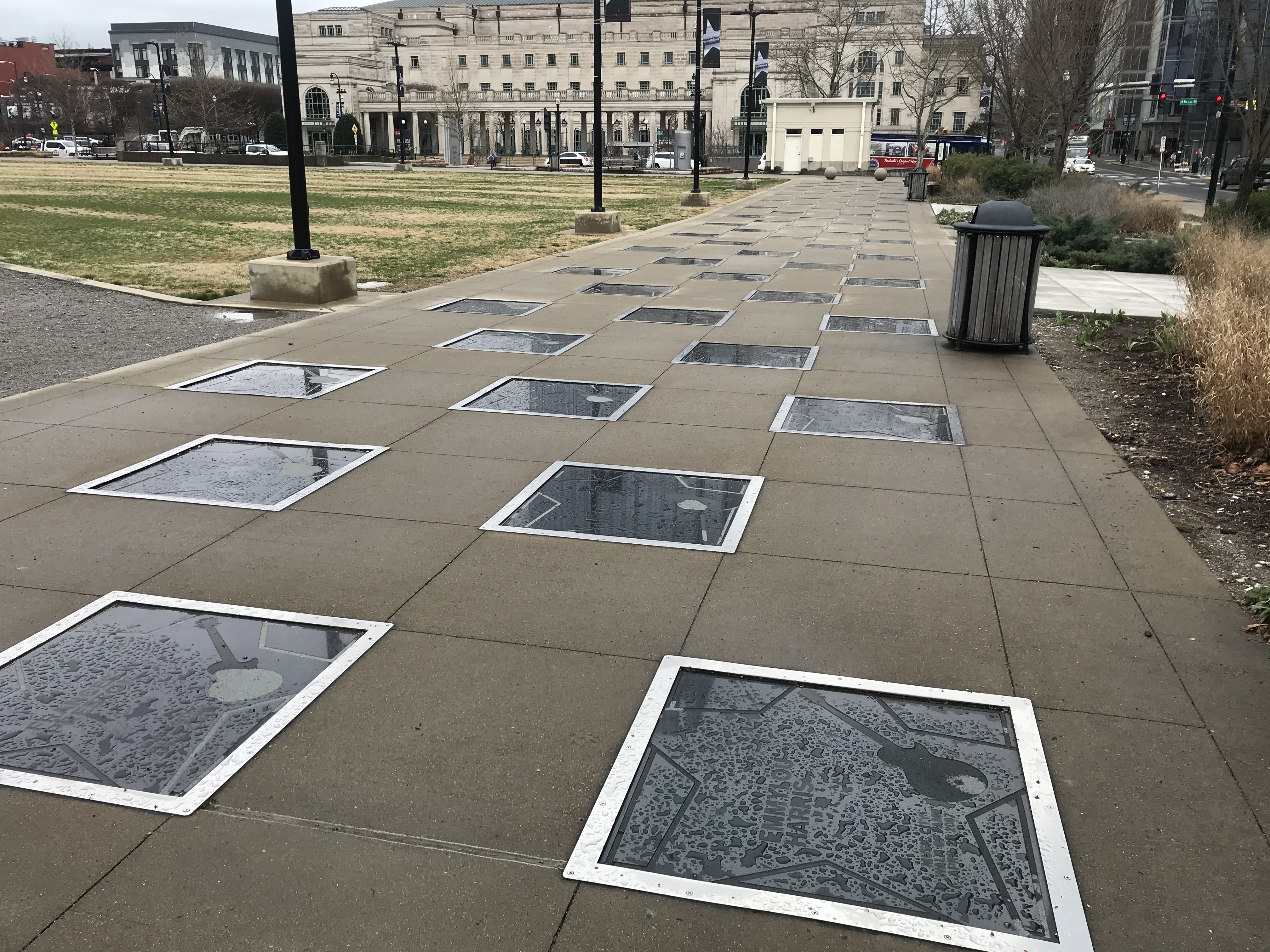 By the riverside I parked and walked across the Big Four Bridge to Indiana- my first steps in that state as far as I know. Had a coffee, saw a house with a bunch of pig decorations in the yard, headed back, and on the Kentucky side walked around the park a little before heading out. There’s a statue of Lincoln sitting by the river, with a plaque explaining that Lincoln (whose wife was from the area) would come here, and sit and watch as the ships transported slaves, solidifying his aversion to the institution. A moving sculpture, tarnished unfortunately by someone having places a dead pigeon next to him and a paper sign in his hand. Pretty disgraceful. Aside from that, Louisville was an awesome place!